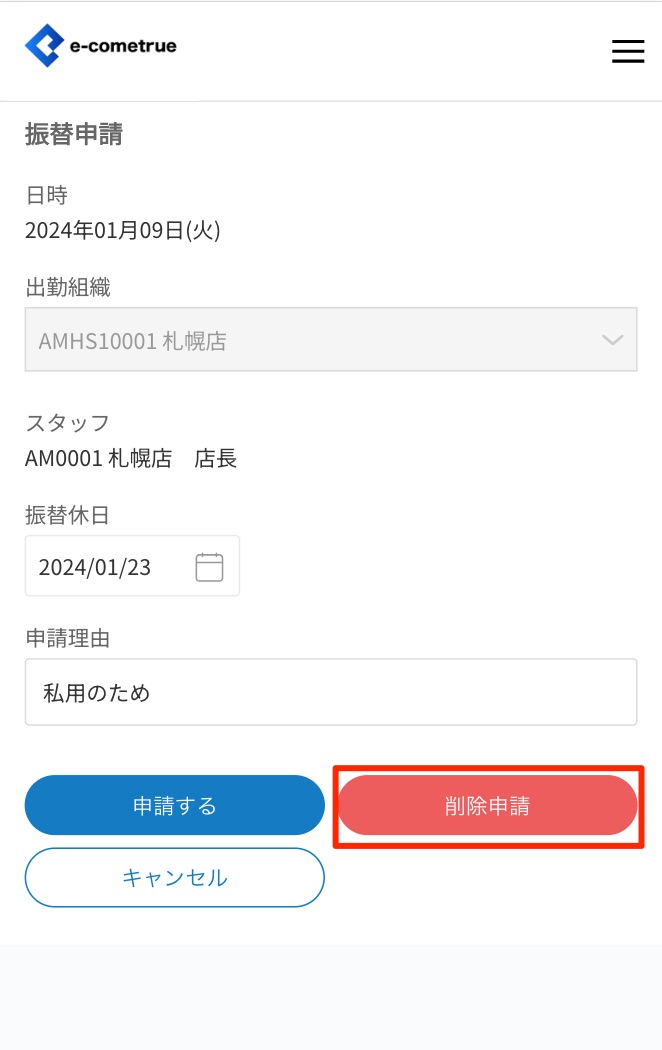 ホーム(スマホ版)>打刻データ確認(スマホ版)>申請>振替申請