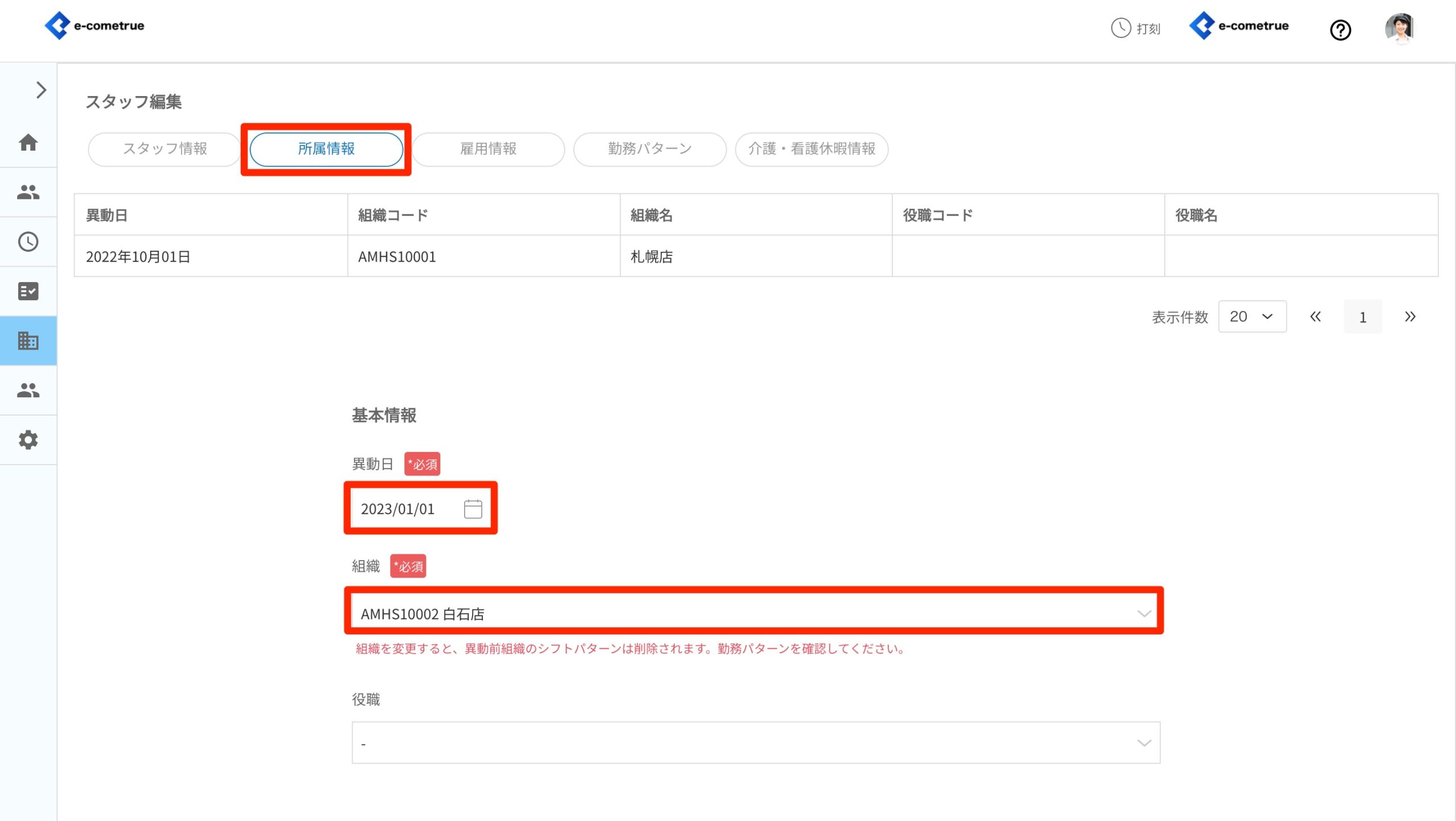 ※異動日を設定しても組織が表示されない場合、異動先組織の操作権限がない事が考えられますのでシステム管理者へ権限を確認ください。