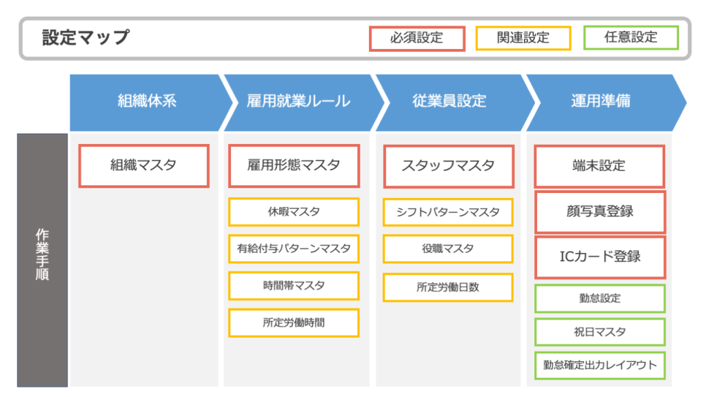 設定フローに応じて必須設定(赤枠)とそれに伴った関連設定(黄枠)がございます。また、運用準備の段階では用途応じて任意設定(緑枠)を行う必要があります。