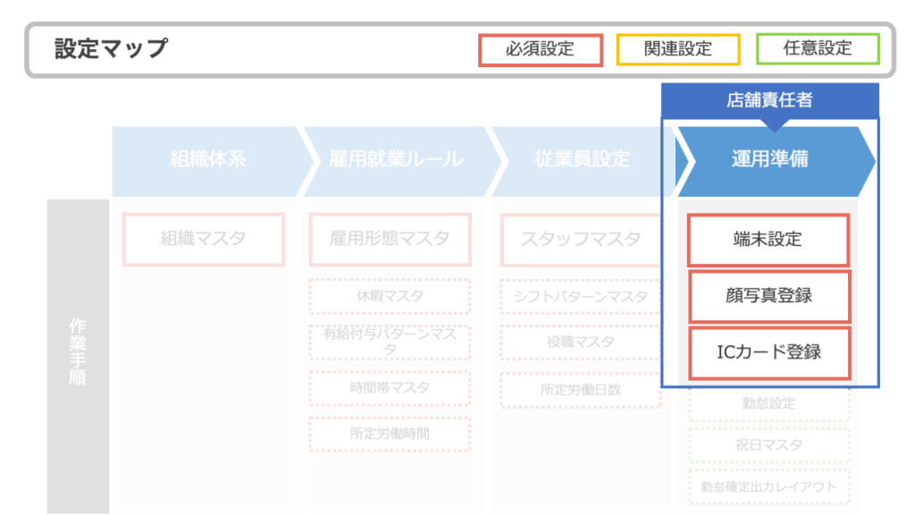 店舗責任者が主体となって初期設定する部分は、運用準備にあたる端末設定や顔写真登録、ICカード登録です。