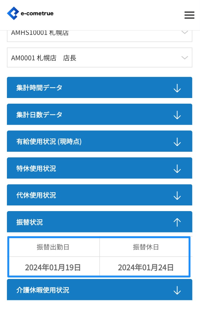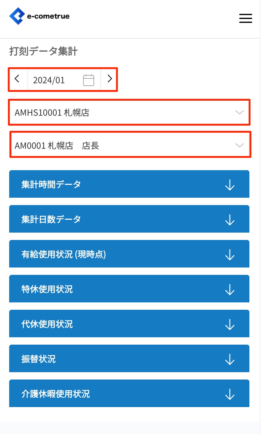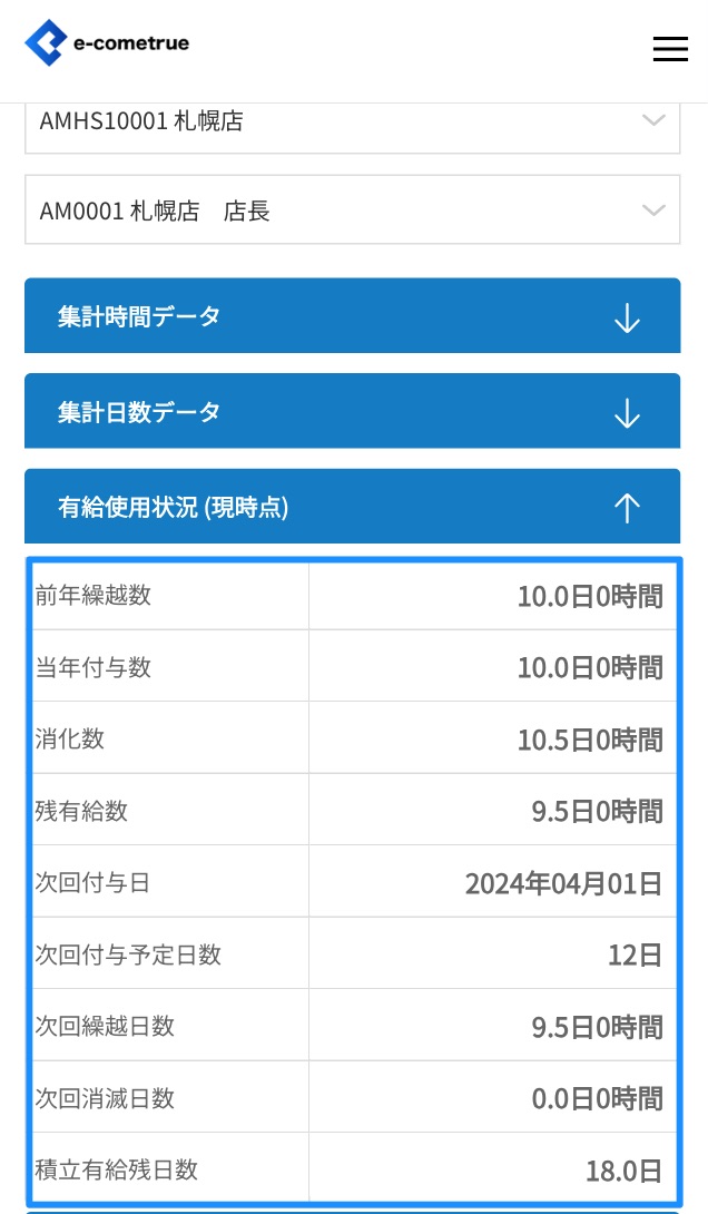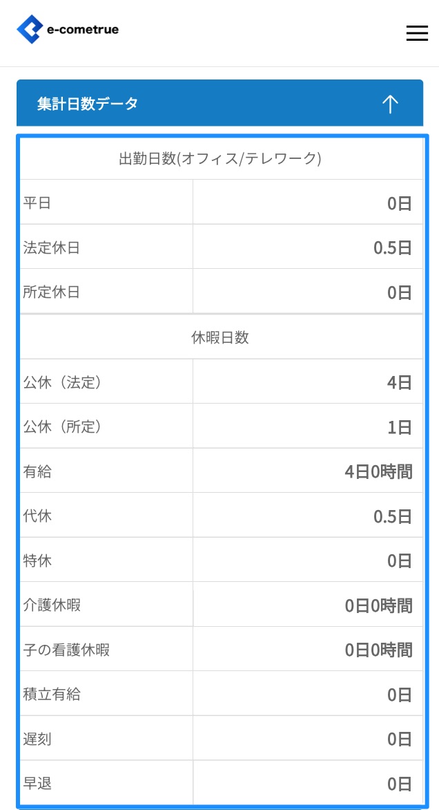 表示希望の選択をすると画面下に日別データ、集計時間、集計日数、有給使用状況 (現時点)、特休使用状況、介護休暇使用状況などに分かれ表示されます。