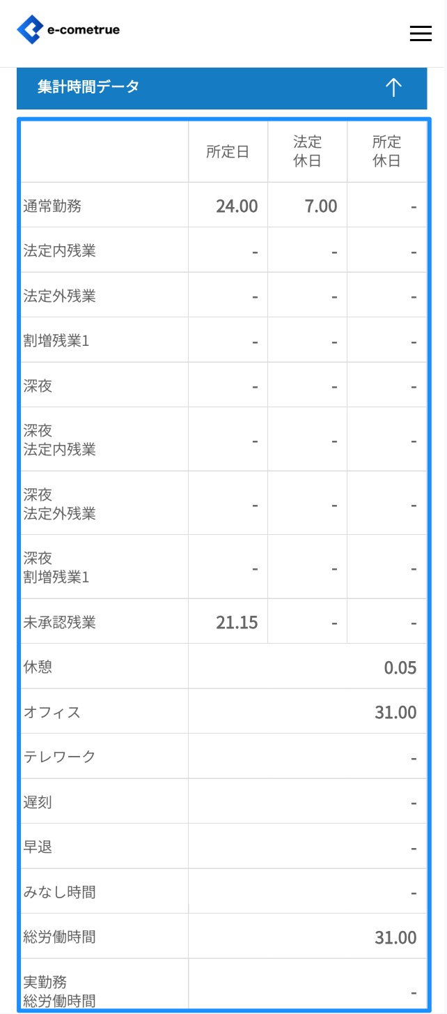 集計時間データをクリックすると、期間の範囲の勤務時間や残業などの集計が表示されます。
