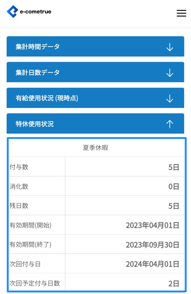 特休を自動付与(残数管理)する場合に表示します。 期間の範囲の特休の状況を表示します。