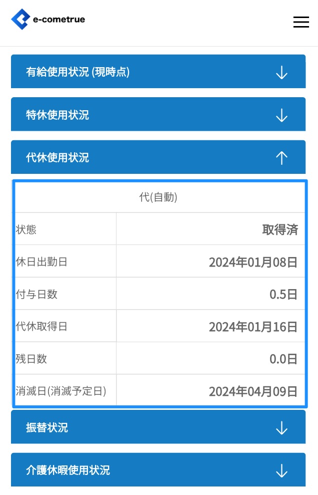 代休を自動付与(残数管理)する場合に表示します。 期間の範囲の代休の状況を表示します。