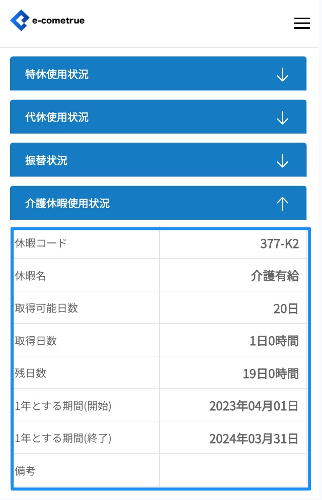 介護休暇を自動付与(残数管理)する場合に表示します。 現時点での介護休暇の状況を表示します。
