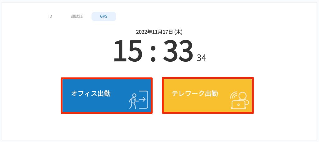 ※雇用形態の打刻方法設定でオフィス・テレワークの区別を「する」に設定すると、「オフィス出勤」「テレワーク出勤」に変わります。