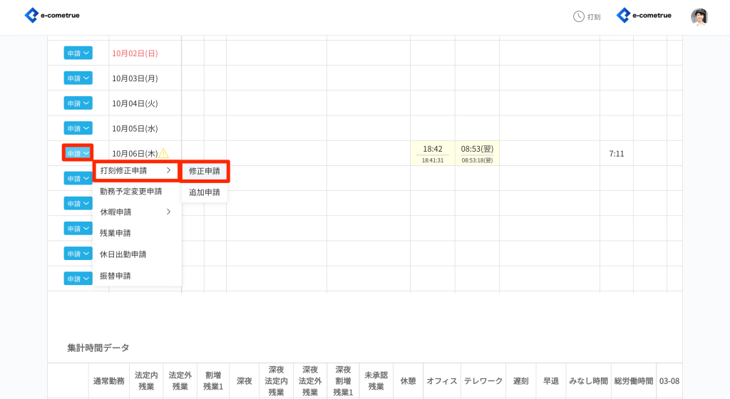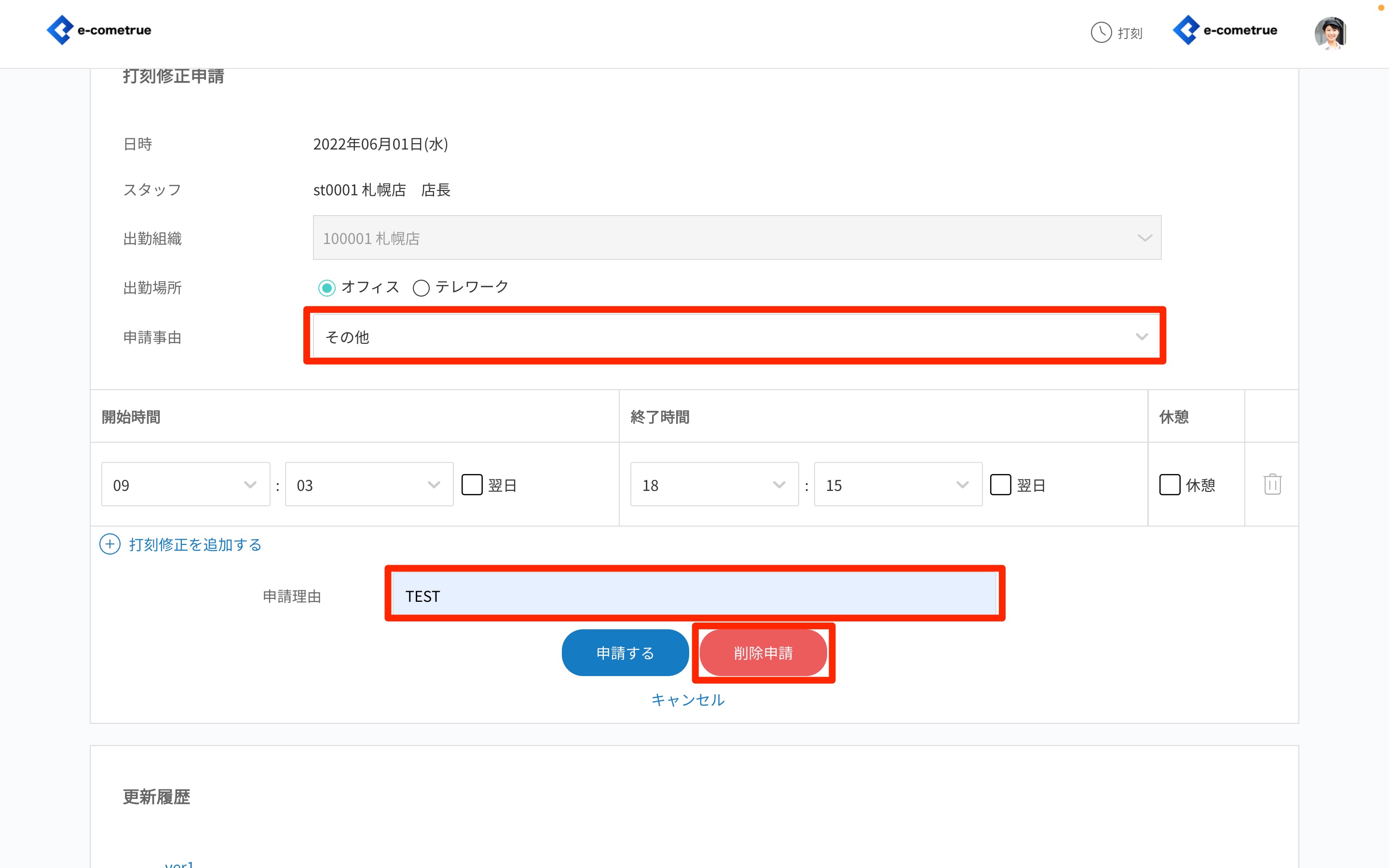 承認済みの申請を取り消すことはできますか? Created 2022年12月15日 Author admin Category 休暇・申請について Q.承認済みの申請を取り消すことはできますか? A.削除申請を行うことで取り消すことができます。 勤務データ確認>打刻データ確認をクリックする 取り消したい日の申請を選択し打刻修正申請>修正申請 をクリックする 申請理由を入力し削除申請をクリックする