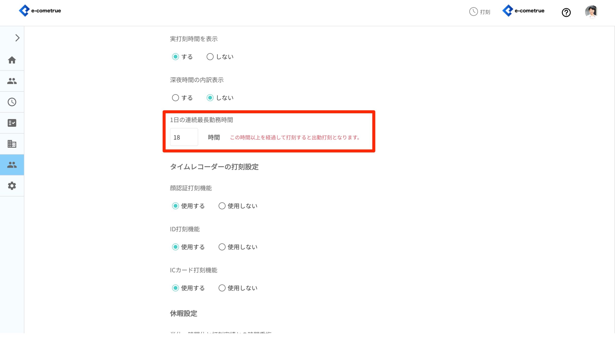 出勤打刻後、連続最長勤務時間を超えた打刻は翌日の出勤となります。