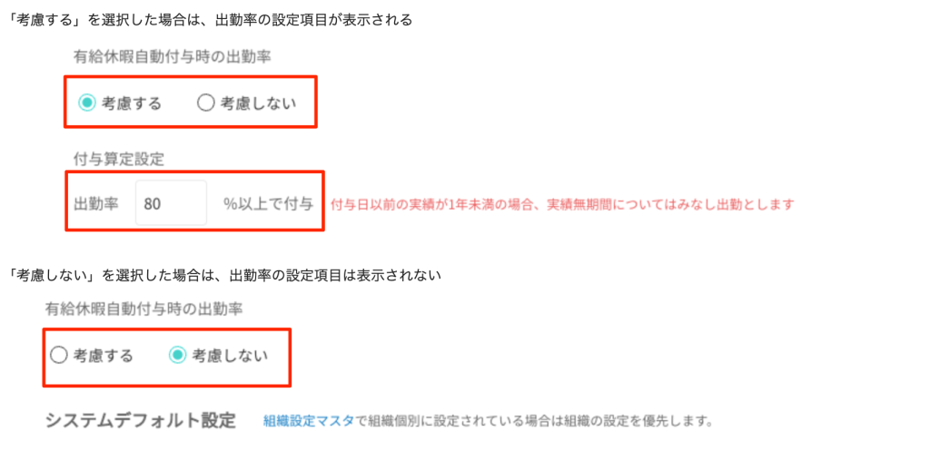 [ 勤怠設定マスタ ] 有給自動付与時の出勤率判定使用有無の設定できる機能を追加しました。