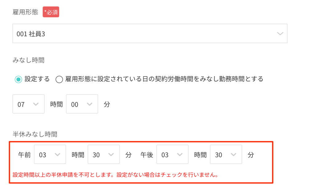 [ スタッフ作成:雇用情報 ] 雇用情報のみなし時間項目に半休取得時間を設定できる機能を追加しました。