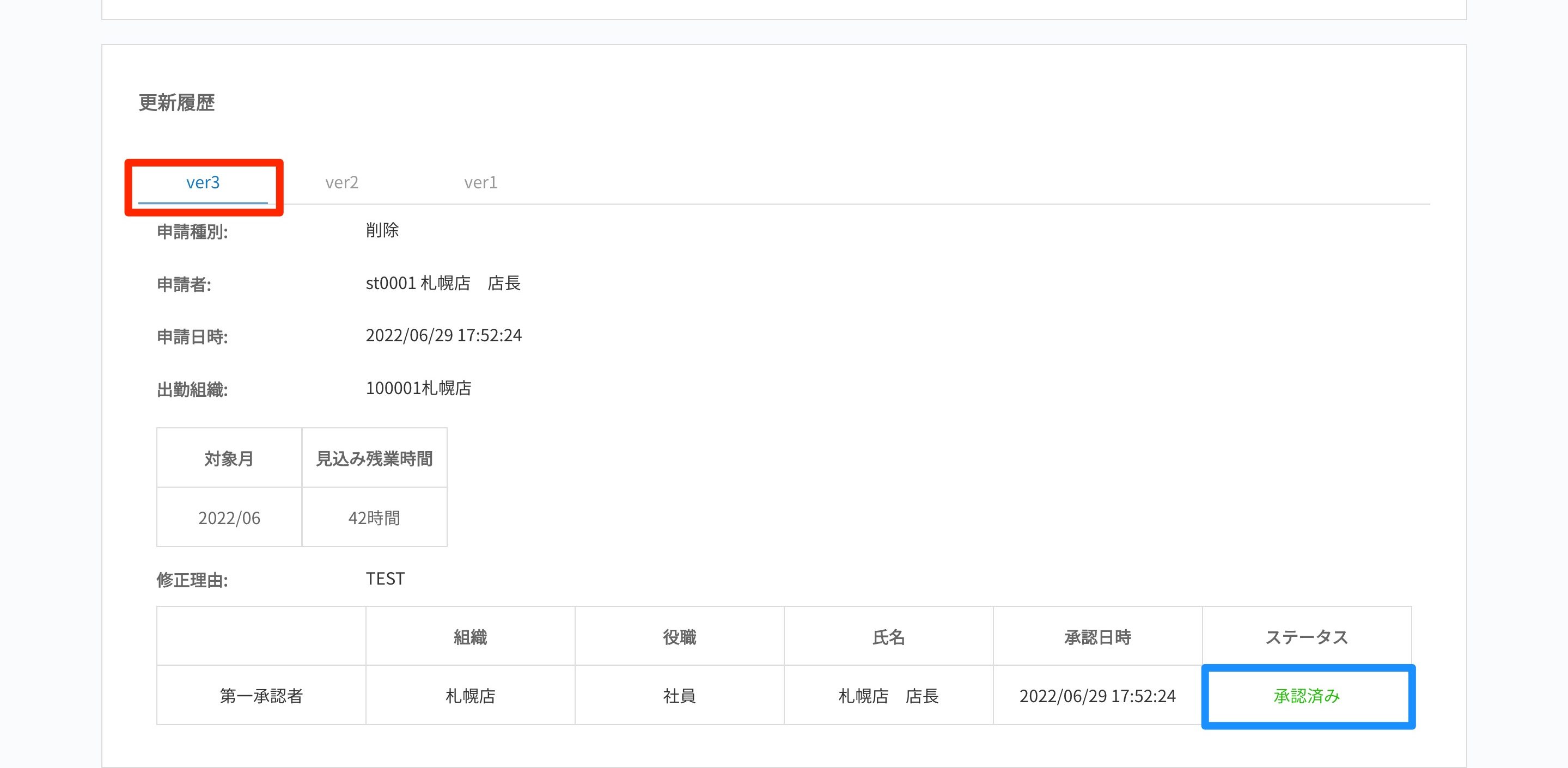 - ステータスには、承認された申請は「承認済み」、未承認の申請には「未承認」と表示されます。