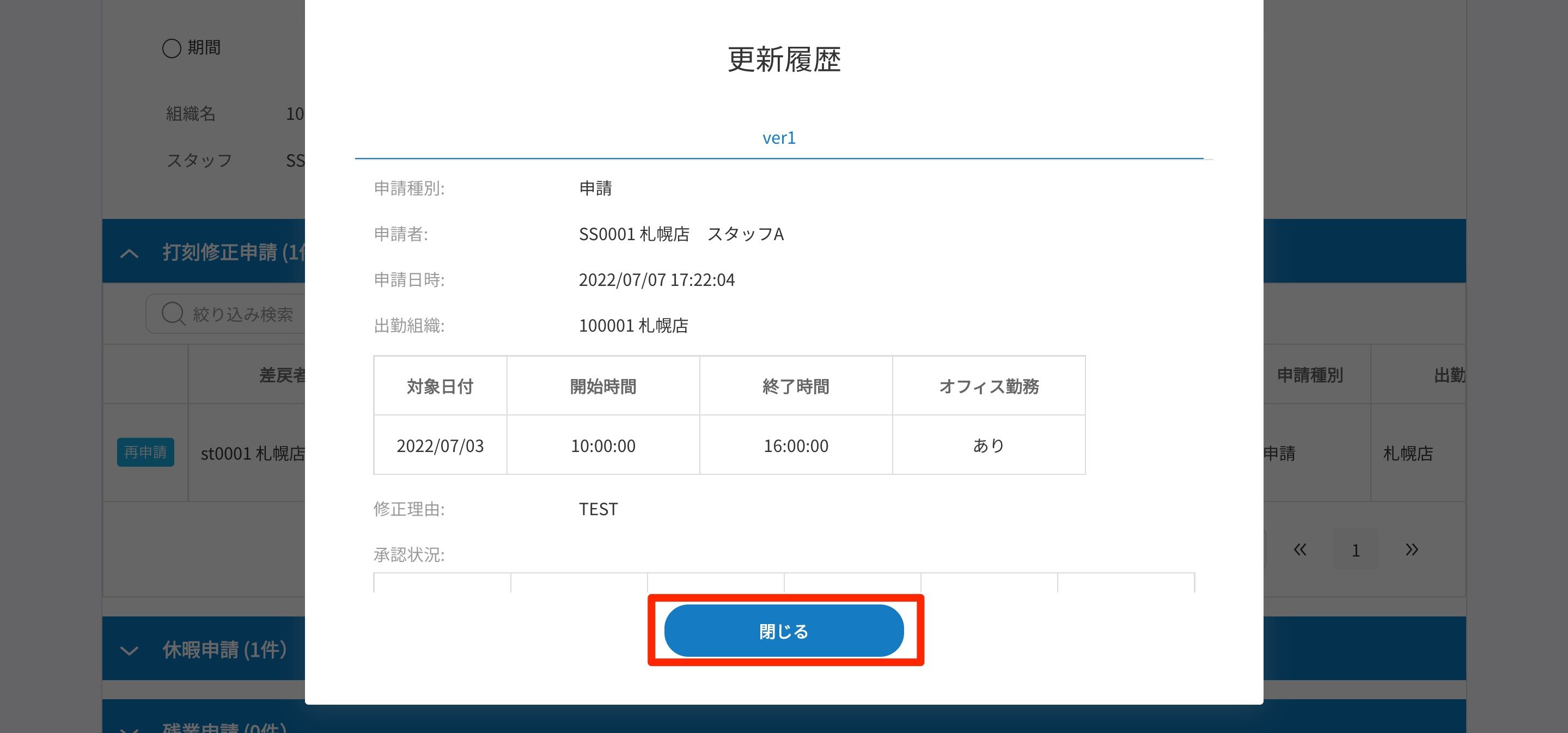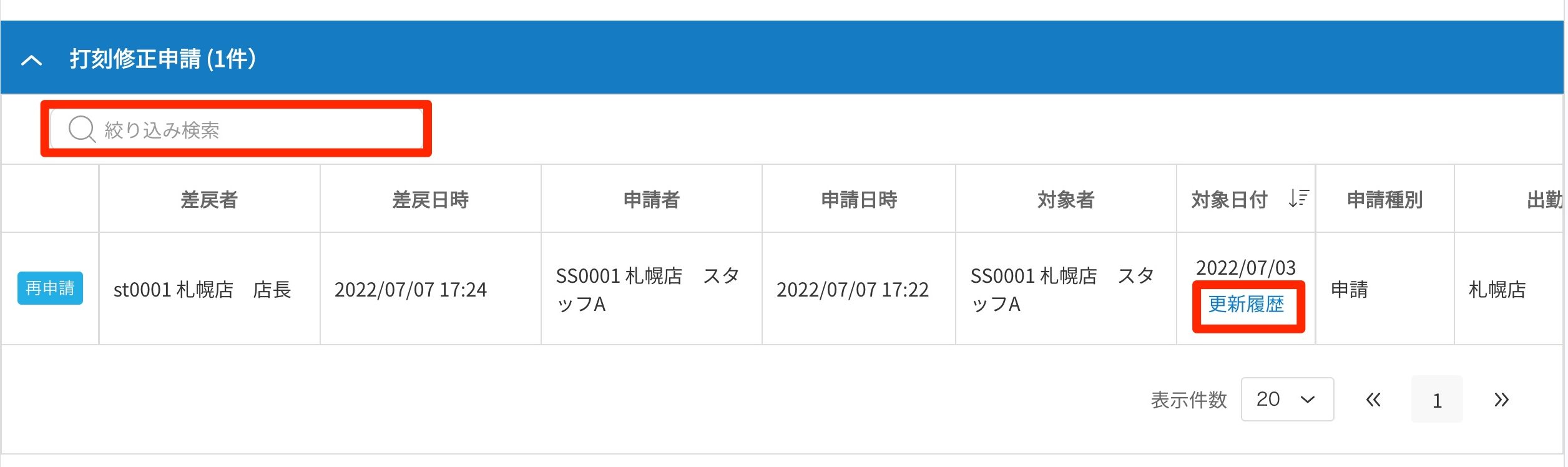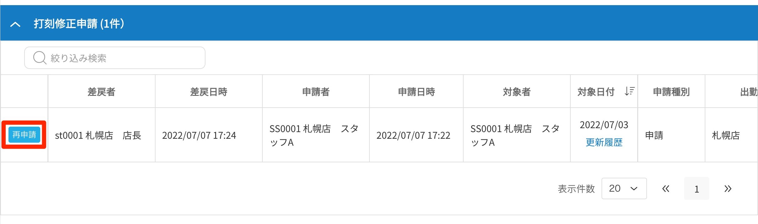 勤怠申請:差戻 Created 2022年7月7日 Author admin Category 勤怠申請 概要 勤怠申請の差戻では各種申請1の確認、再申請をすることができます。 操作 ホーム>勤怠管理>勤怠申請>差戻 できること 各種申請の内容を確認する 差戻された申請を再申請をする 各種申請の内容を確認する 各種申請2の内容を確認することができます 操作方法 期間を選択する 確認したい申請をクリックする 打刻修正申請、休暇申請、残業申請、手当申請、休日出勤申請、振替申請、限度時間超過申請、勤務予定変更申請、積立有給申請 検索したい文字列を絞り込み検索に入力し絞り込みする 確認したい申請の更新履歴をクリックする ポップアップで更新履歴を確認し、閉じるをクリックする 差戻された申請を再申請する 差戻された申請のを再申請することができます。 操作方法 編集をクリックする ※各種申請画面へ遷移します。 打刻修正申請・打刻追加申請・勤務予定変更申請・休暇申請・残業申請・手当申請・休日出勤申請・振替申請・積立有給申請 打刻修正申請、休暇申請、残業申請、手当申請、休日出勤申請、振替申請、限度時間超過申請、勤務予定変更申請、積立有給申請打刻修正申請、休暇申請、残業申請、手当申請、休日出勤申請、振替申請、限度時間超過申請、勤務予定変更申請、積立有給申請