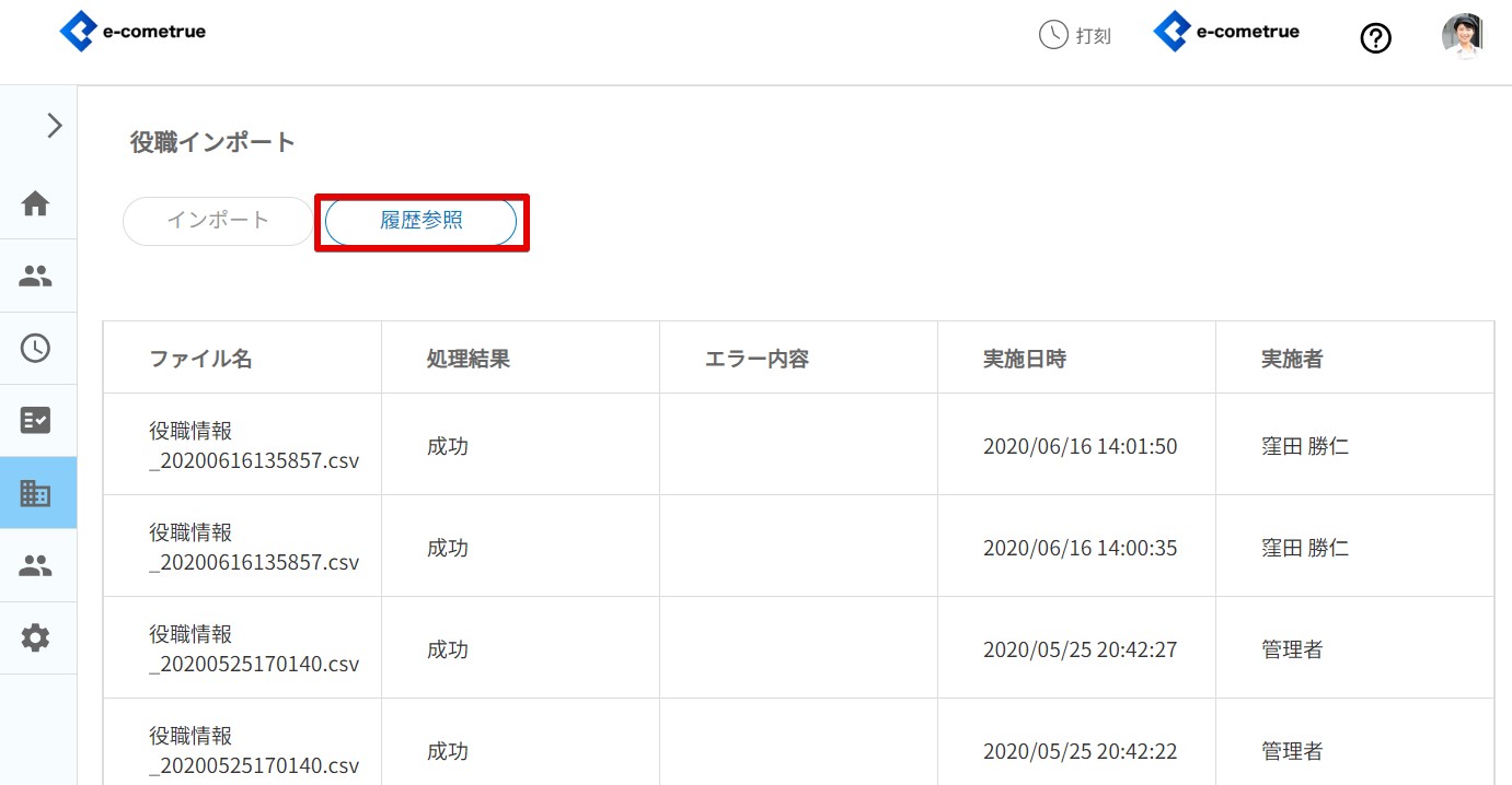 インポートしたファイル名やインポートした日時、エラー内容などが表示されます。