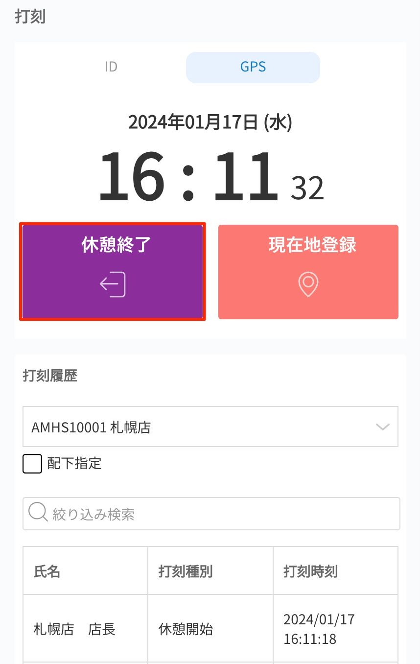 休憩中のスタッフの終了打刻を行います。