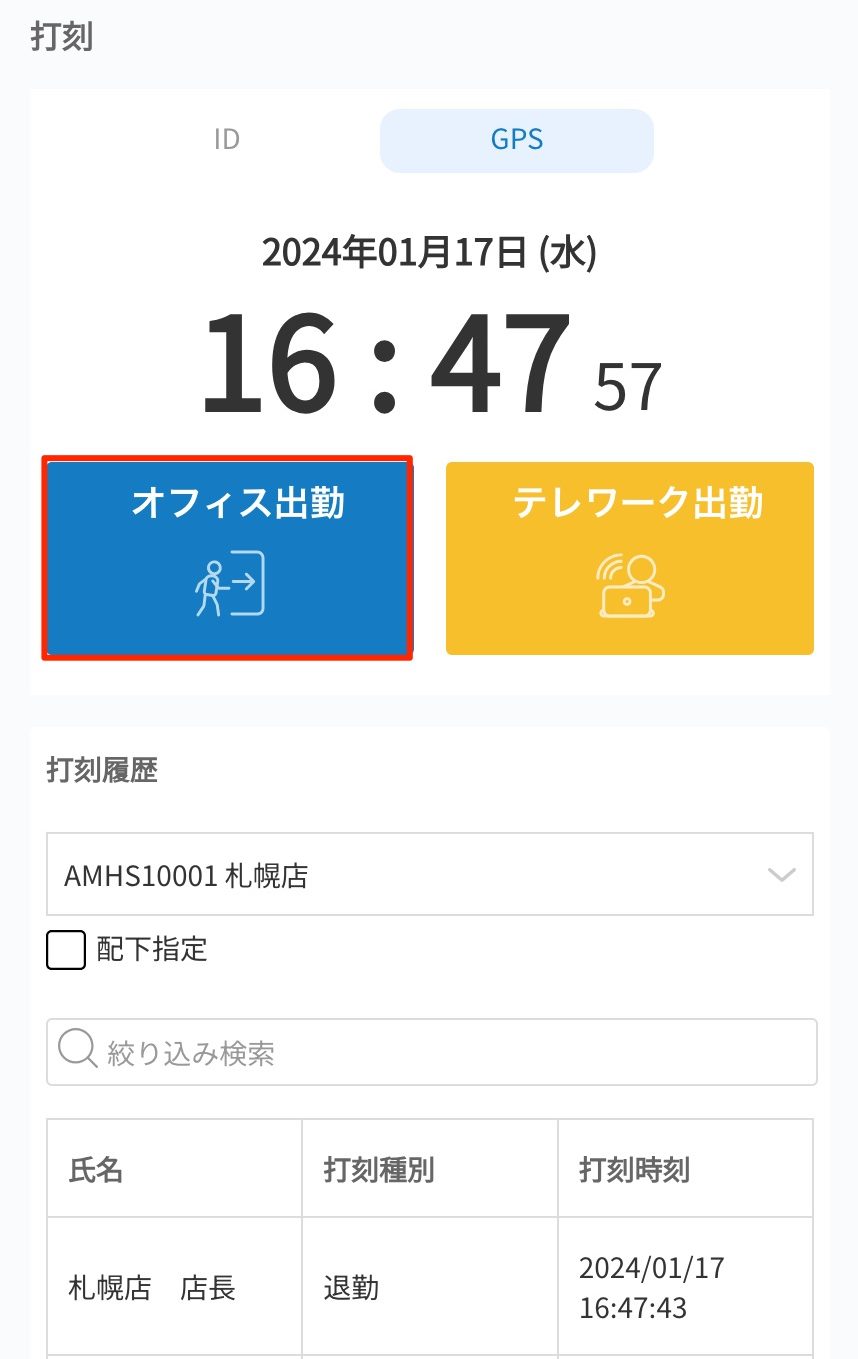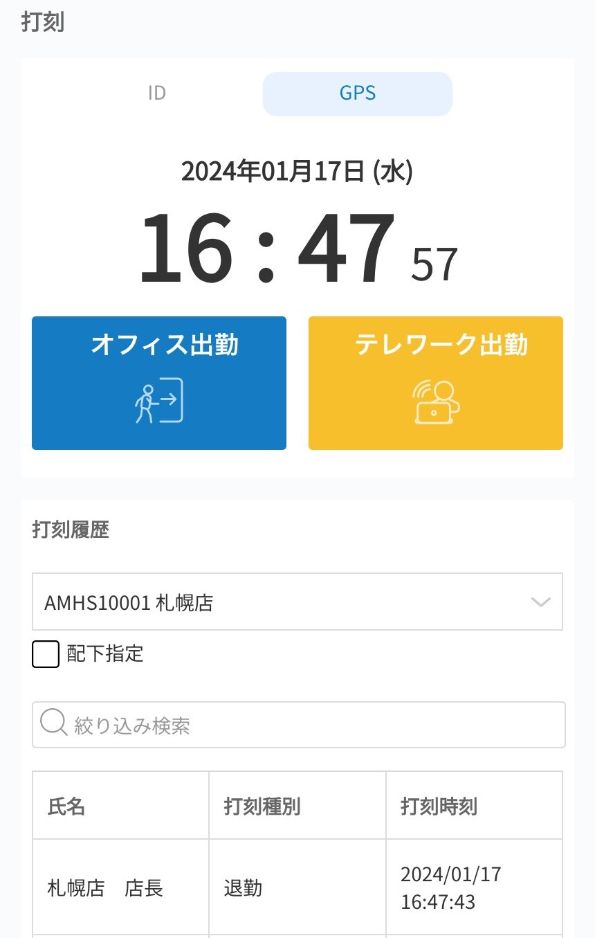 打刻すると、現在の位置情報と打刻時間が記録されます。