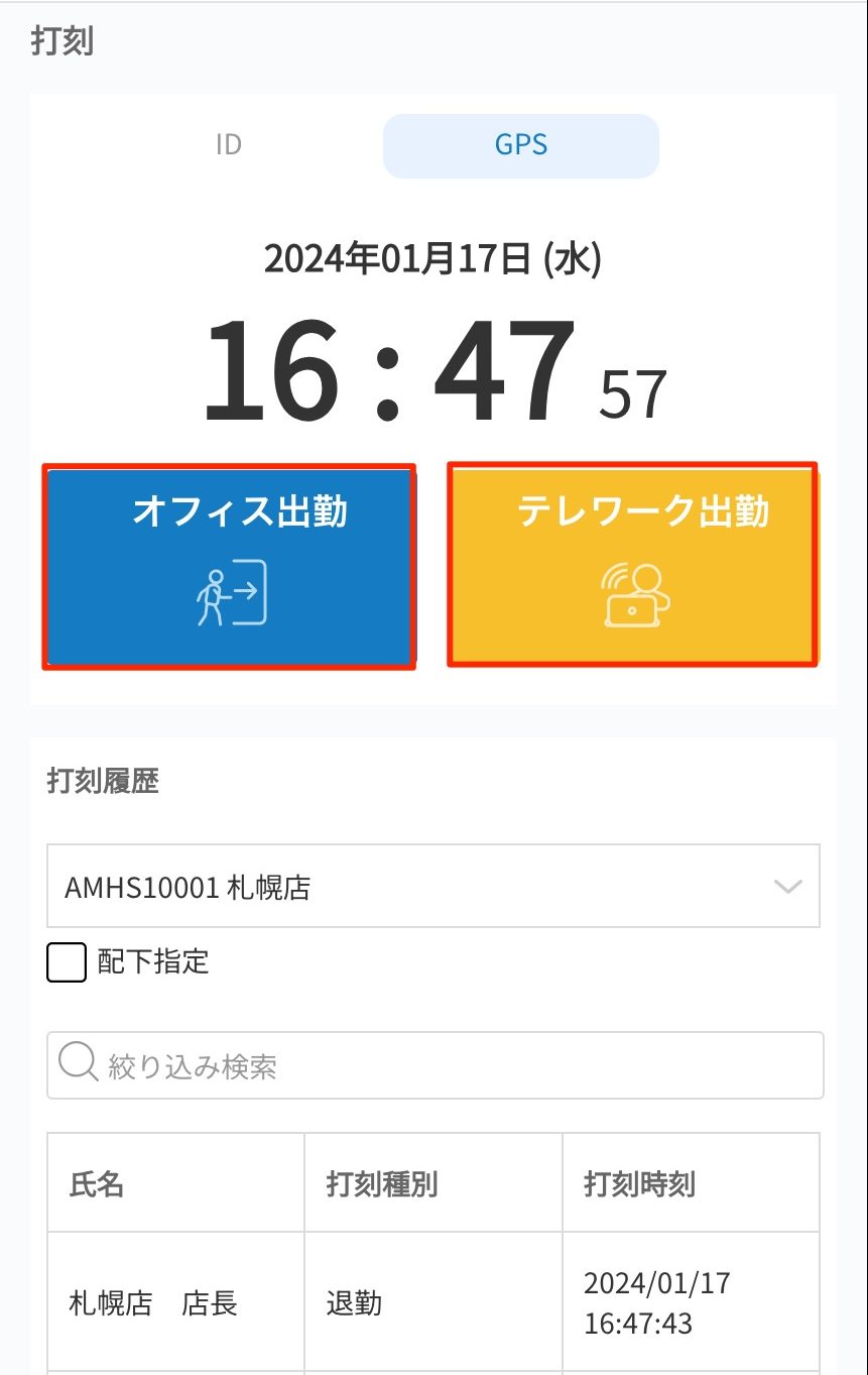 ※雇用形態の打刻方法設定でオフィス・テレワークの区別を「する」に設定すると、「オフィス出勤」「テレワーク出勤」に変わります。タイムレコーダーの場合は適用されません。
