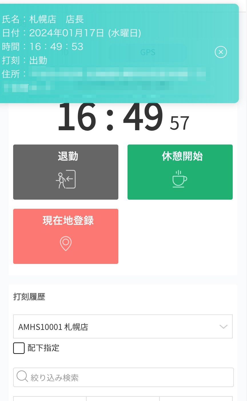 ※打刻が完了すると右上に打刻内容のメッセージが表示されます。GPSで取得した位置情報が、住所として表示されます。