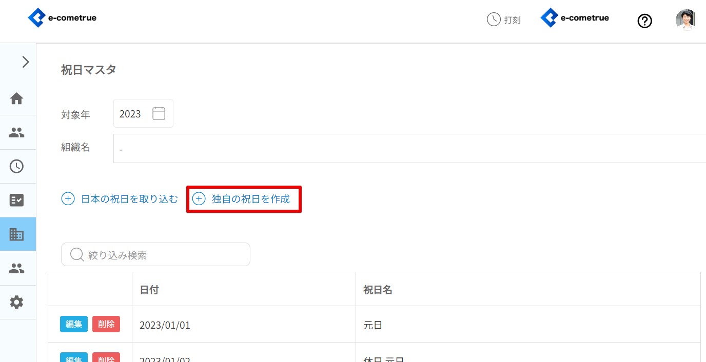 祝日では、日本の祝日をはじめ、創立記念日など独自の休日を管理することができます。