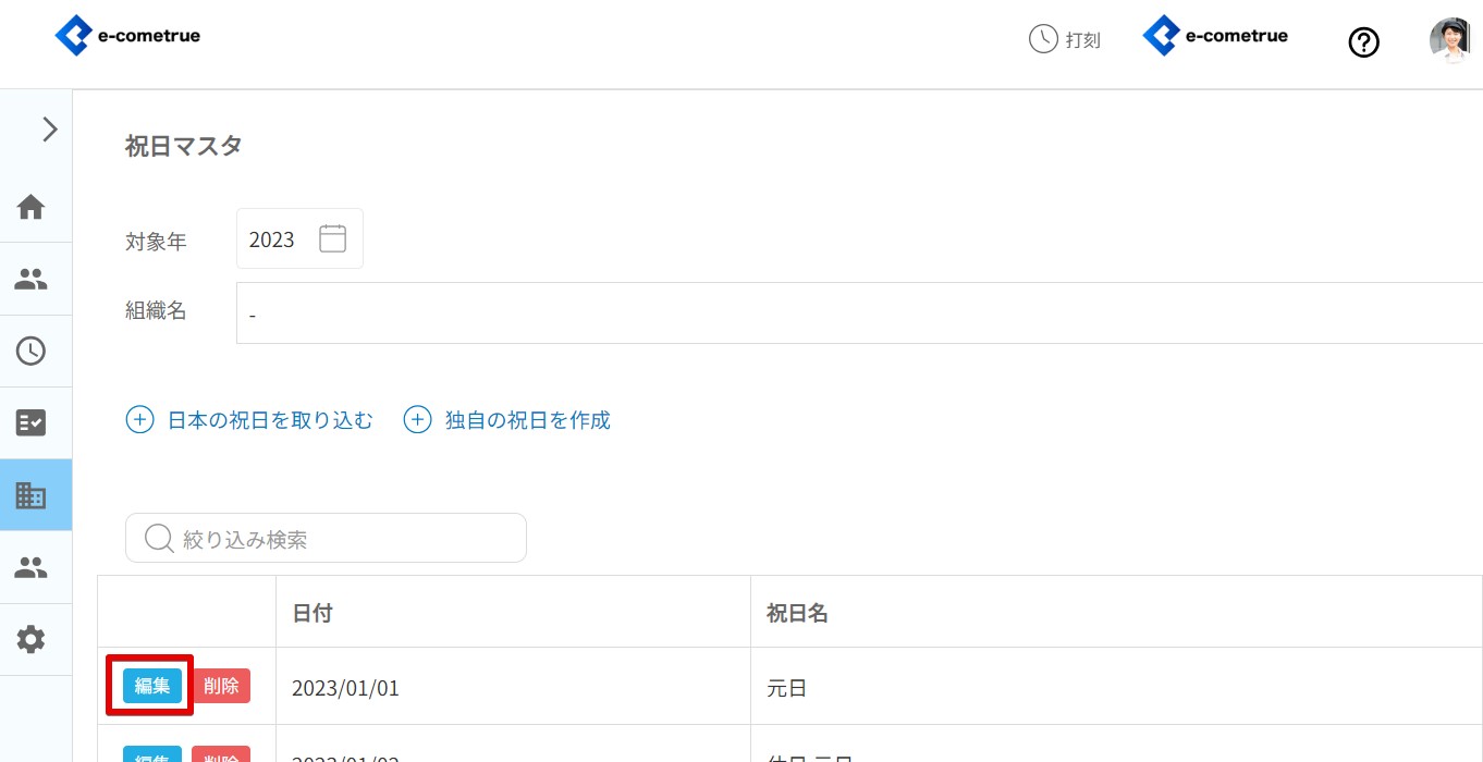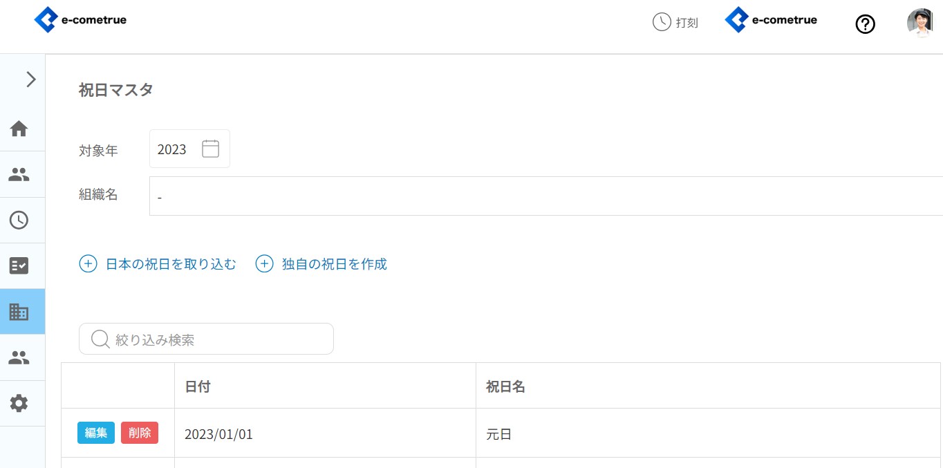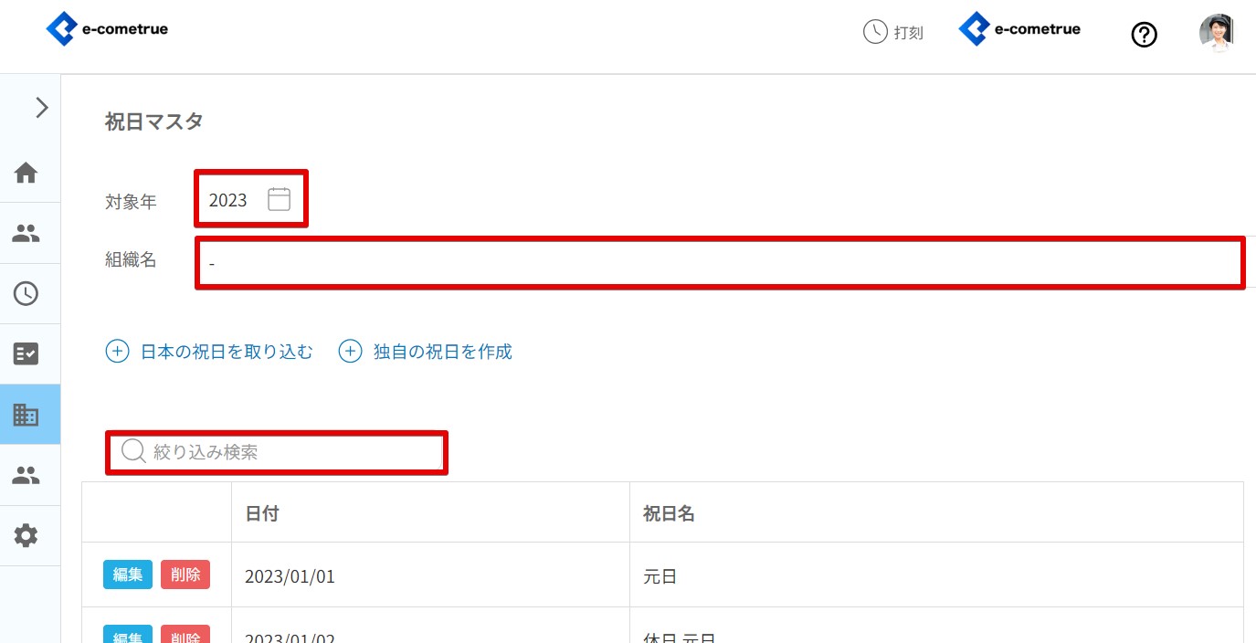 フィールドの年を選択すると、その年の祝日が一覧に表示されます。 - 組織で絞り込みする