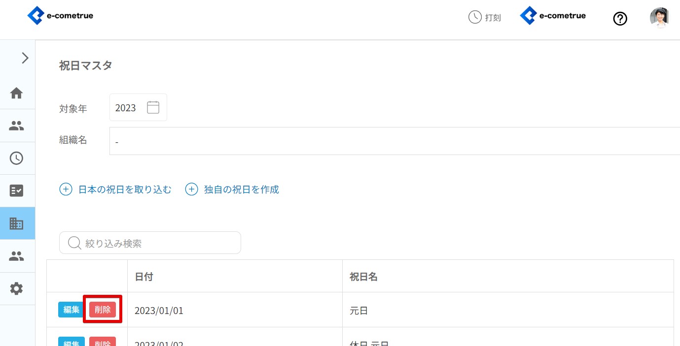 祝日がなくなったり、誤って登録した場合などにお使いください。