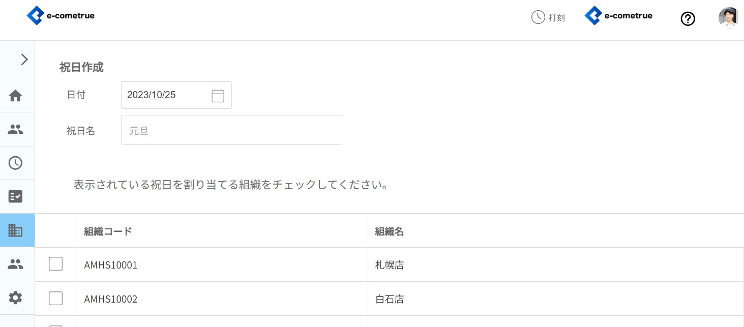 祝日作成では、日本の祝日をはじめ、創立記念日など独自の休日を新規登録することができます。