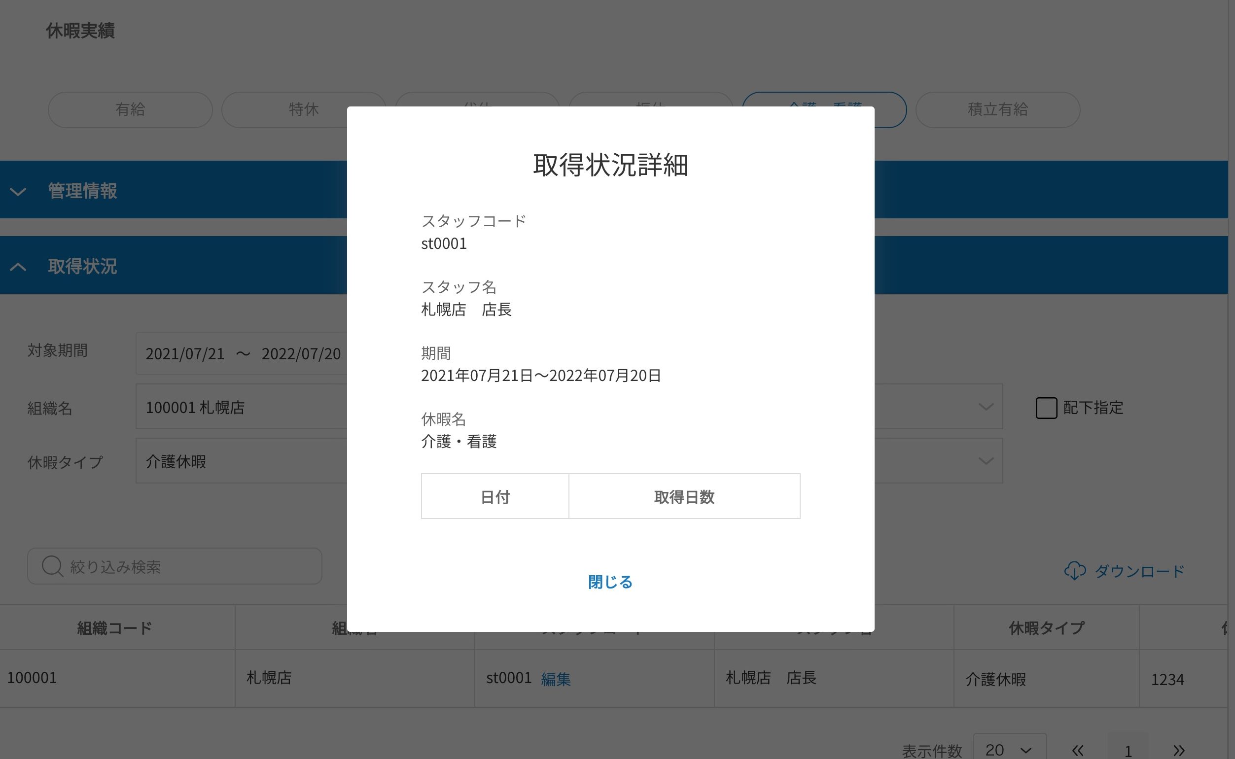 ※表示されるスタッフは、休暇マスタで介護休暇を登録時に、有給算出基準:勤務日数への加算を「加算する」と設定したスタッフが対象となります。
