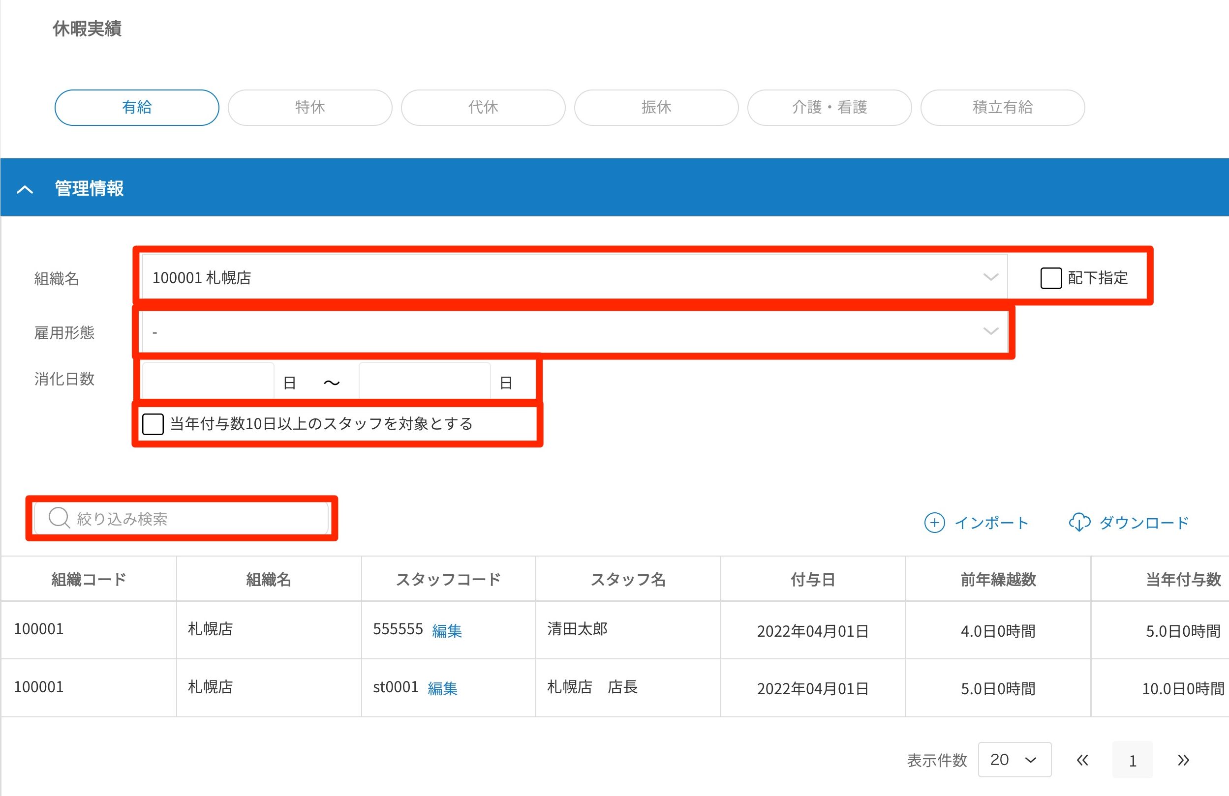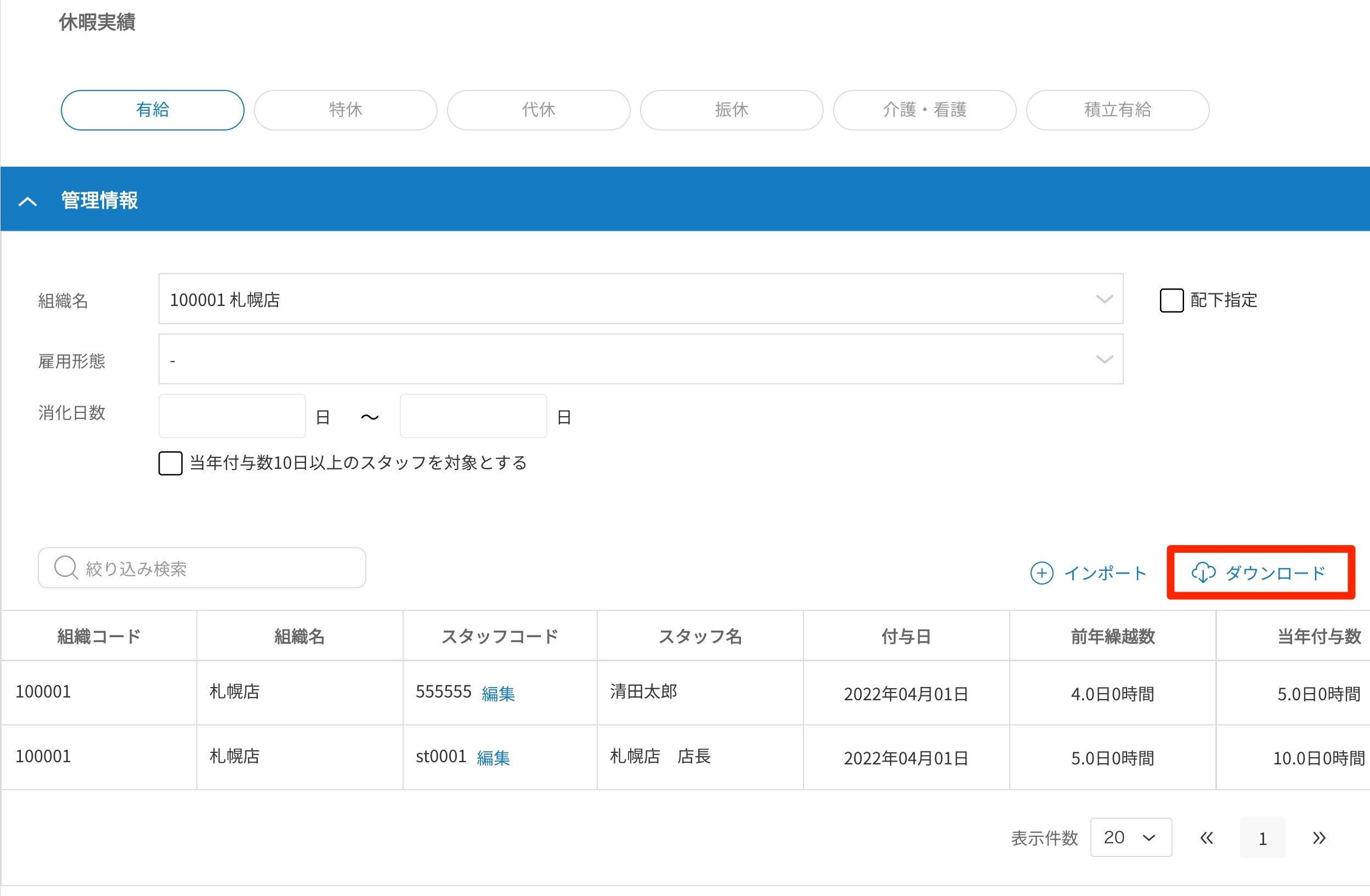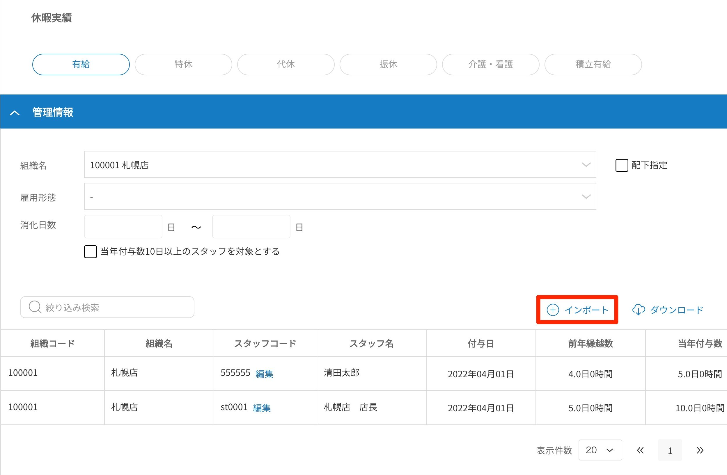有給の管理情報・付与履歴・取得状況の確認とインポートとダウンロードができます。