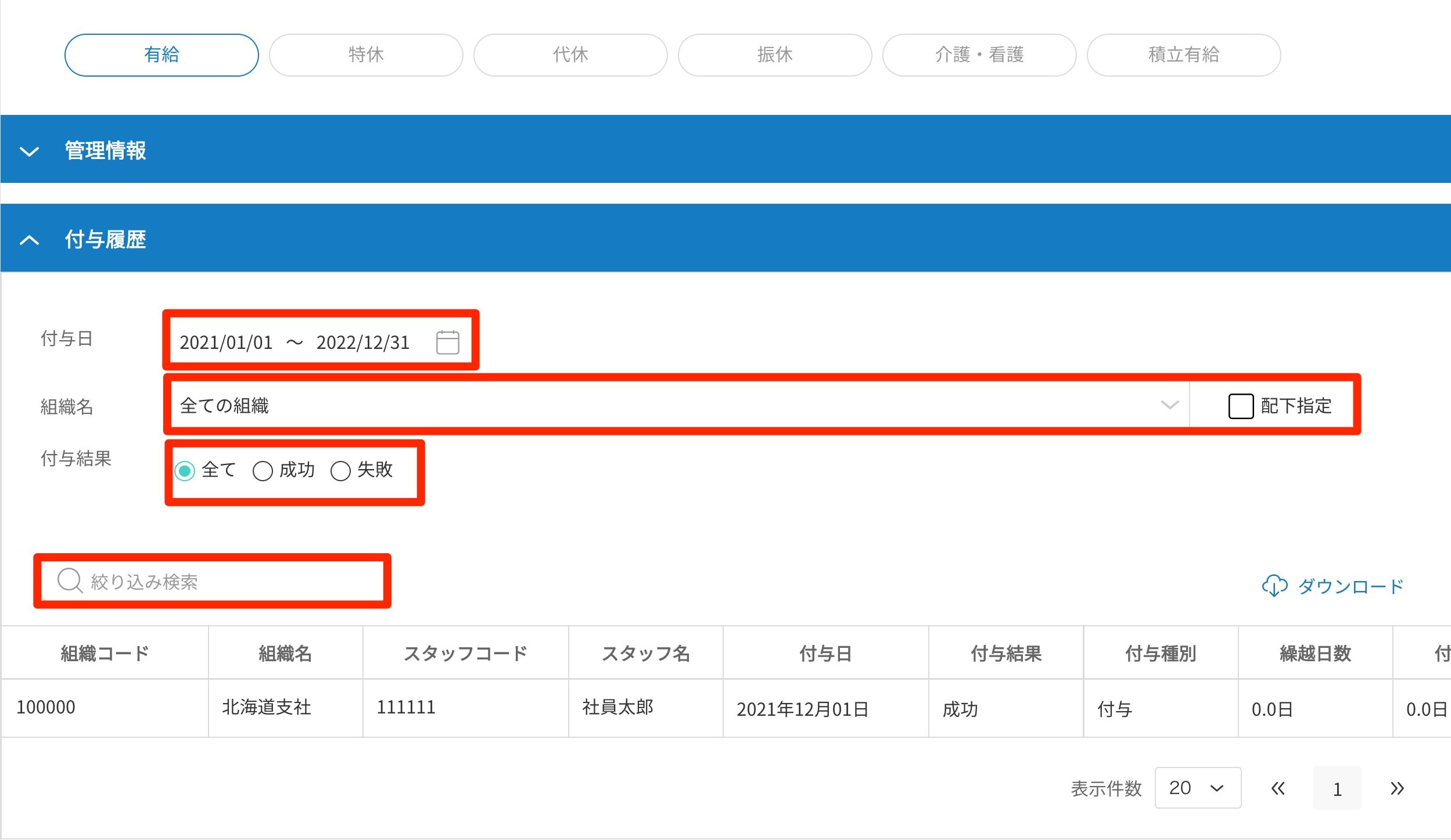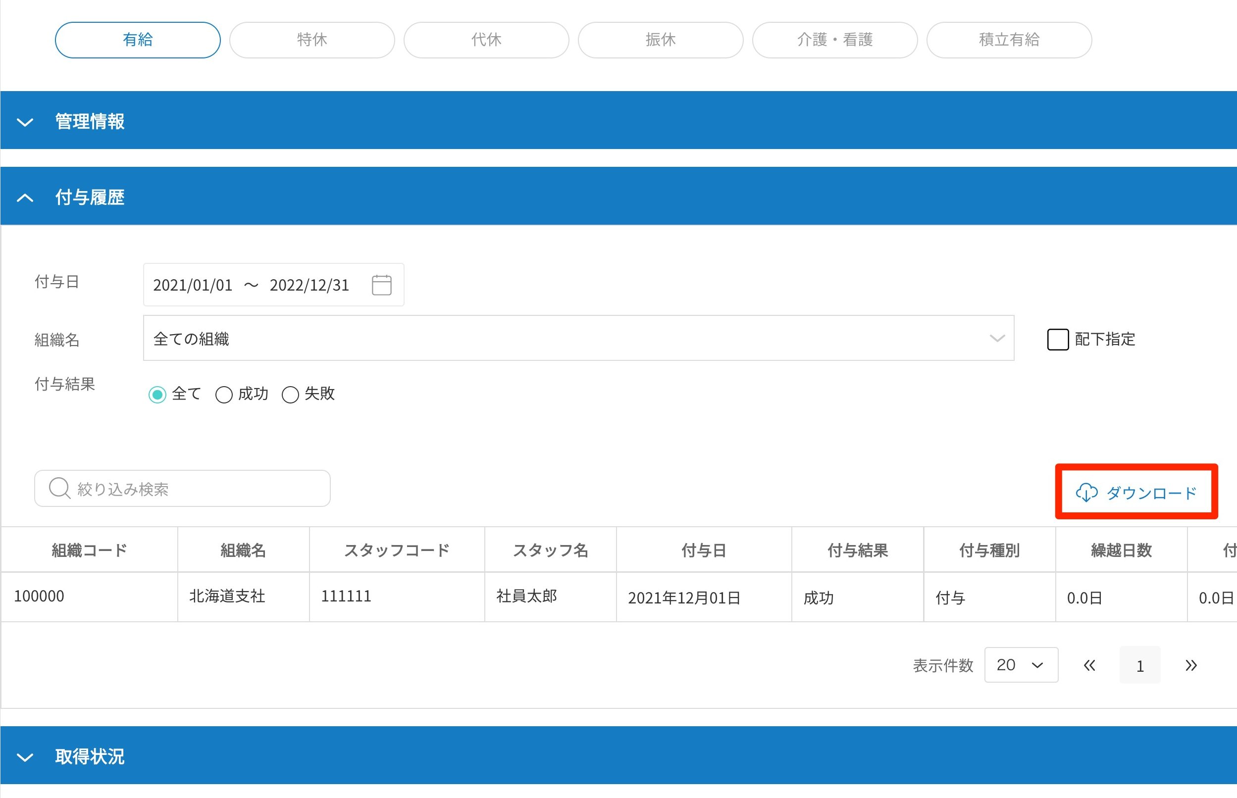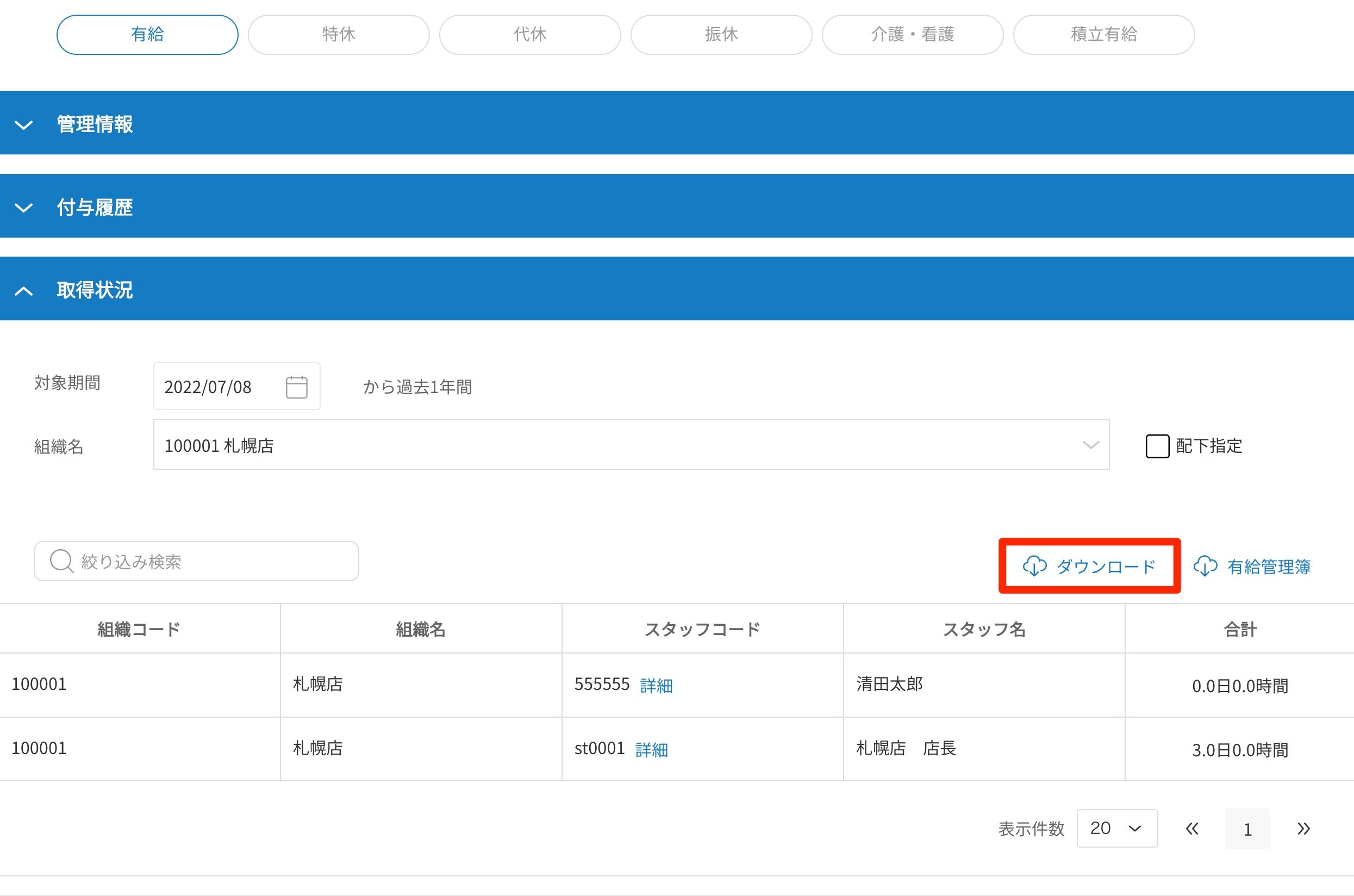 有給の管理情報・付与履歴・取得状況の確認とインポートとダウンロードができます。