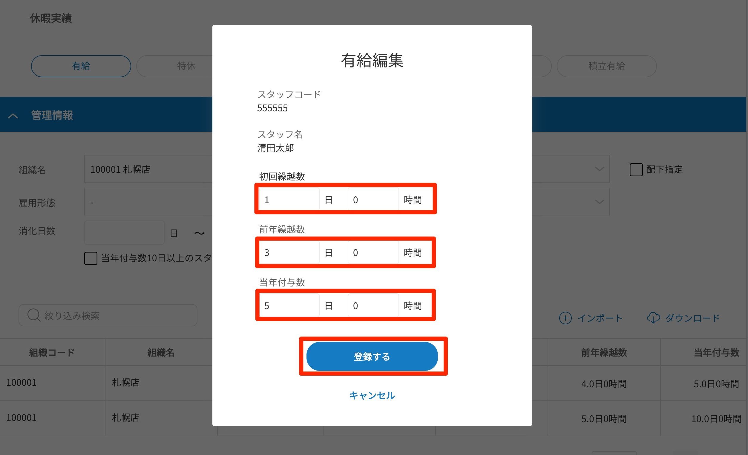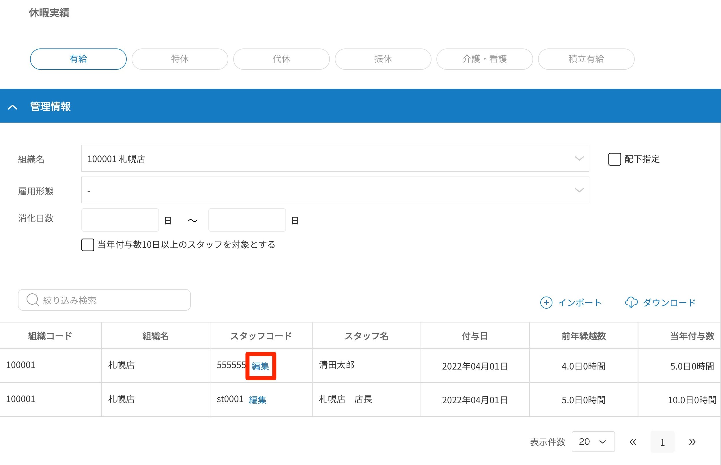 スタッフの付与状況に応じて、初回繰越数、前年繰越数、初回付与数、当年付与数を変更できます。