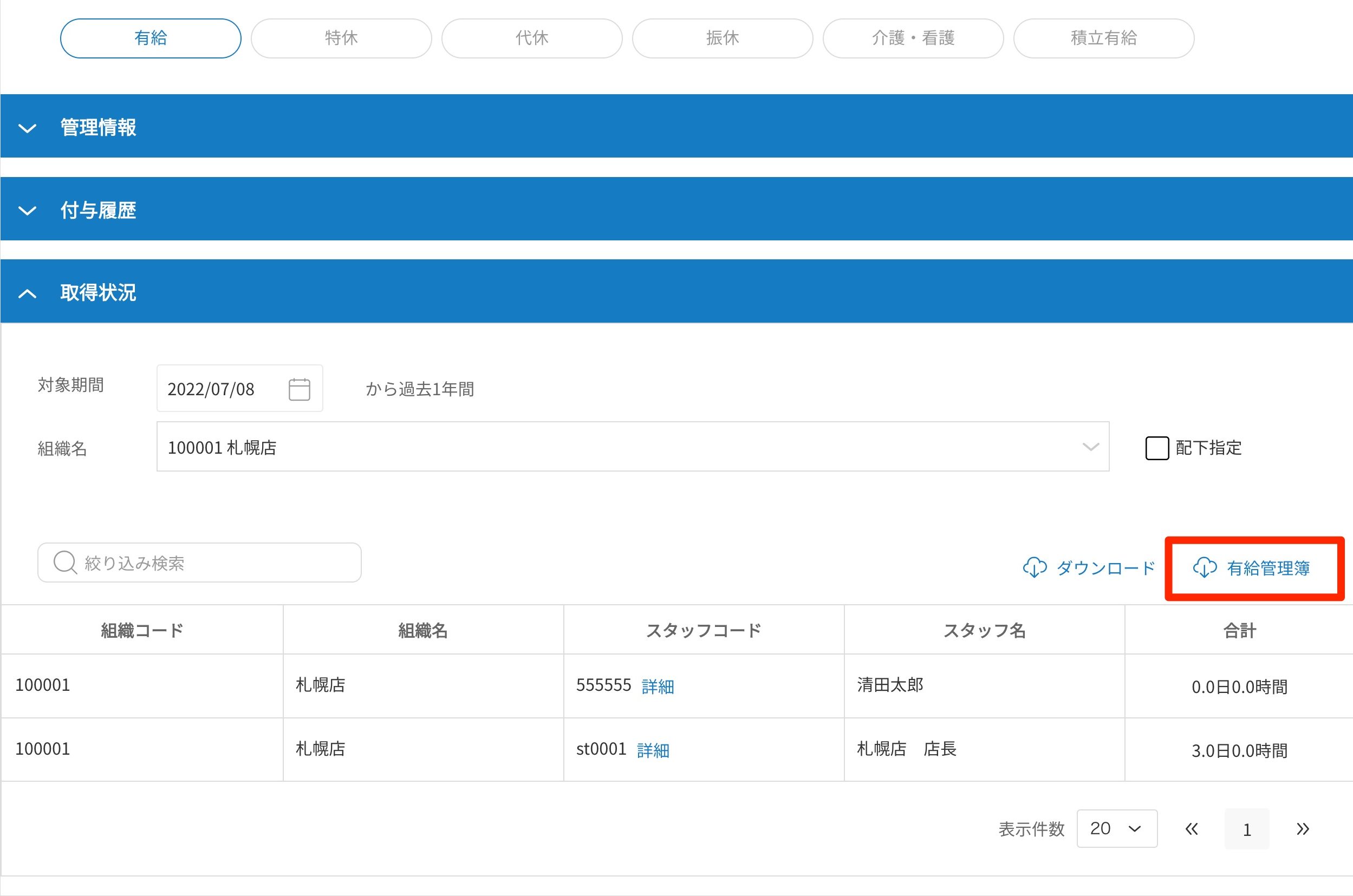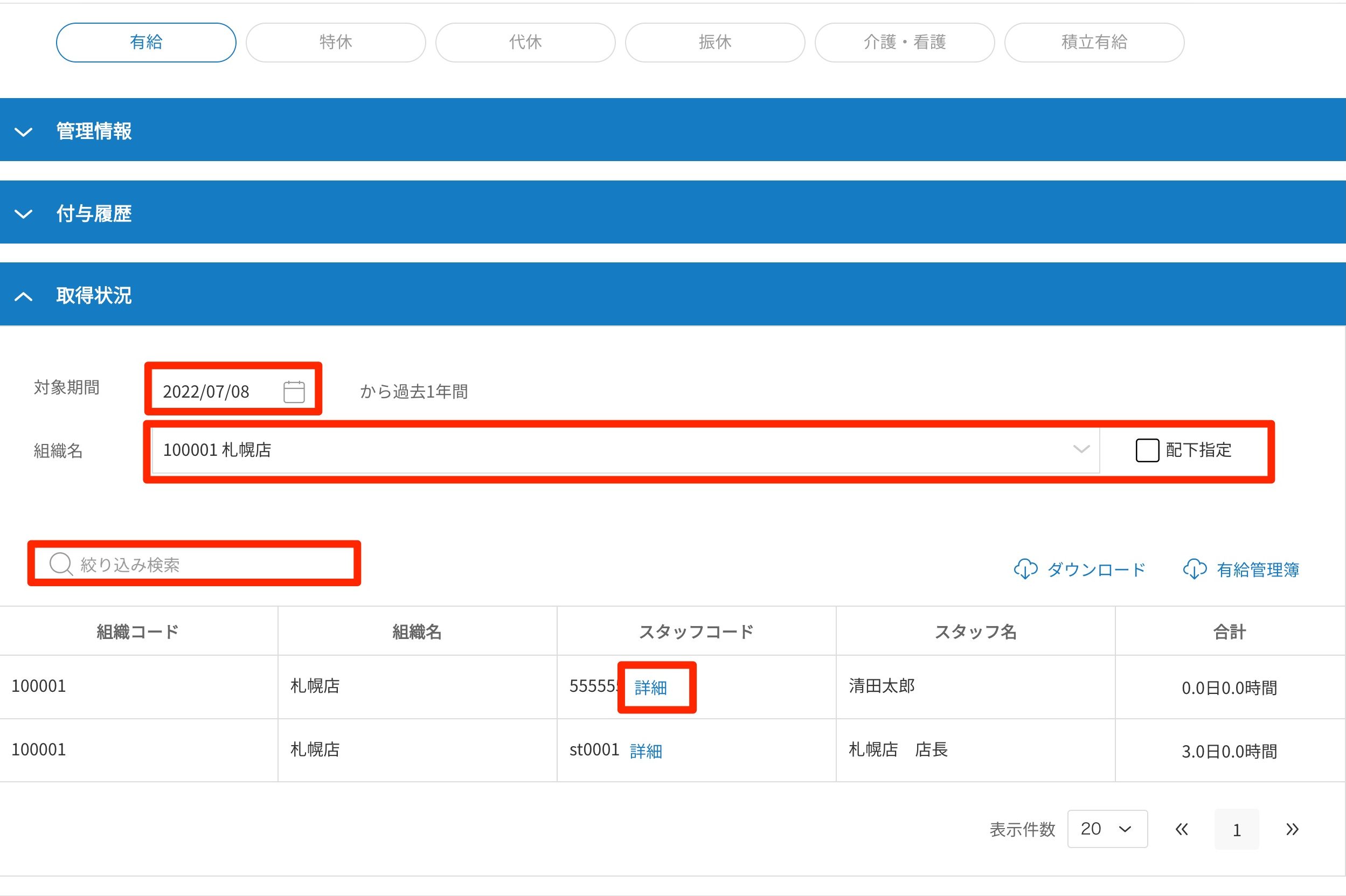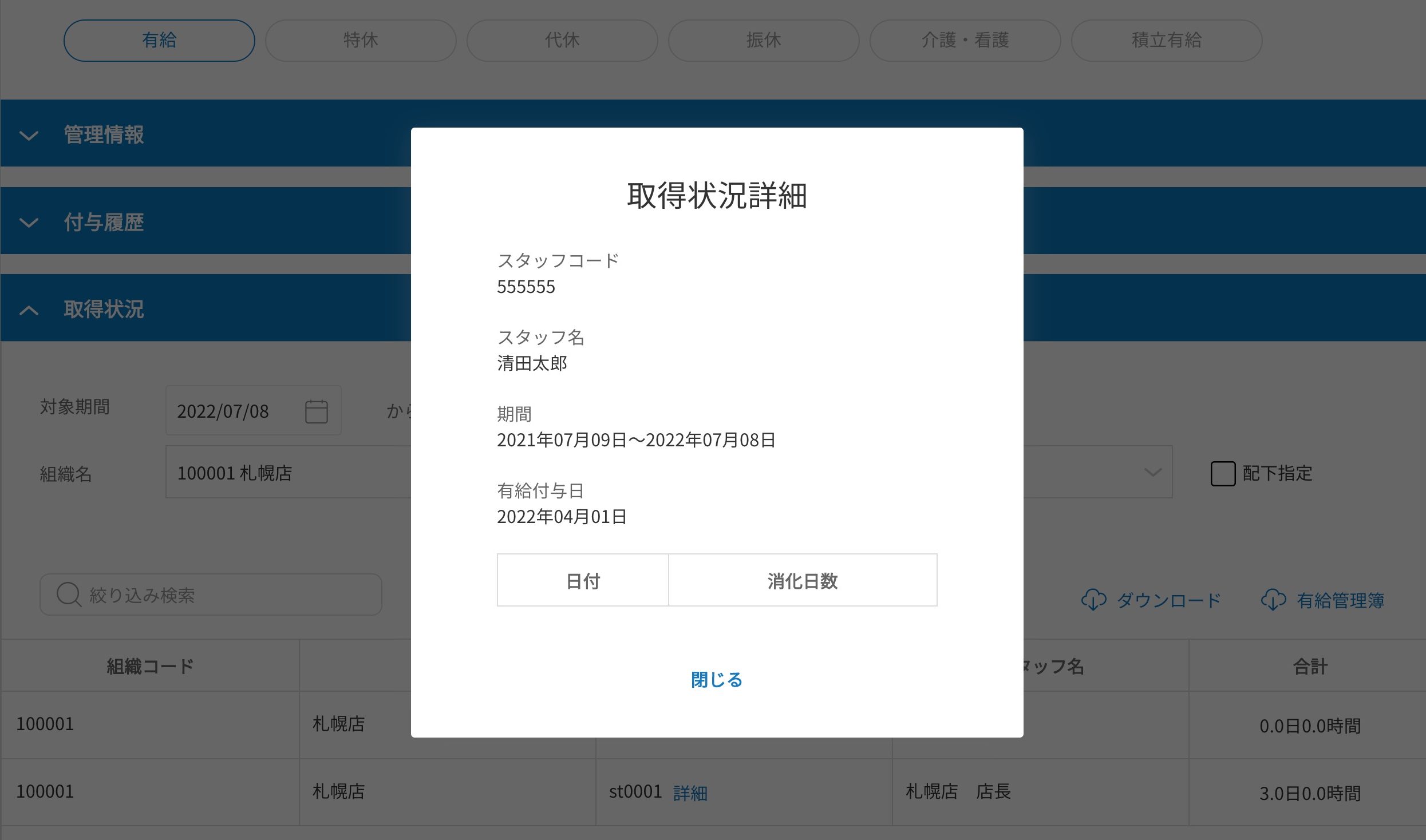 指定した条件に該当するスタッフの現在の有給管理情報が一覧で表示されます。