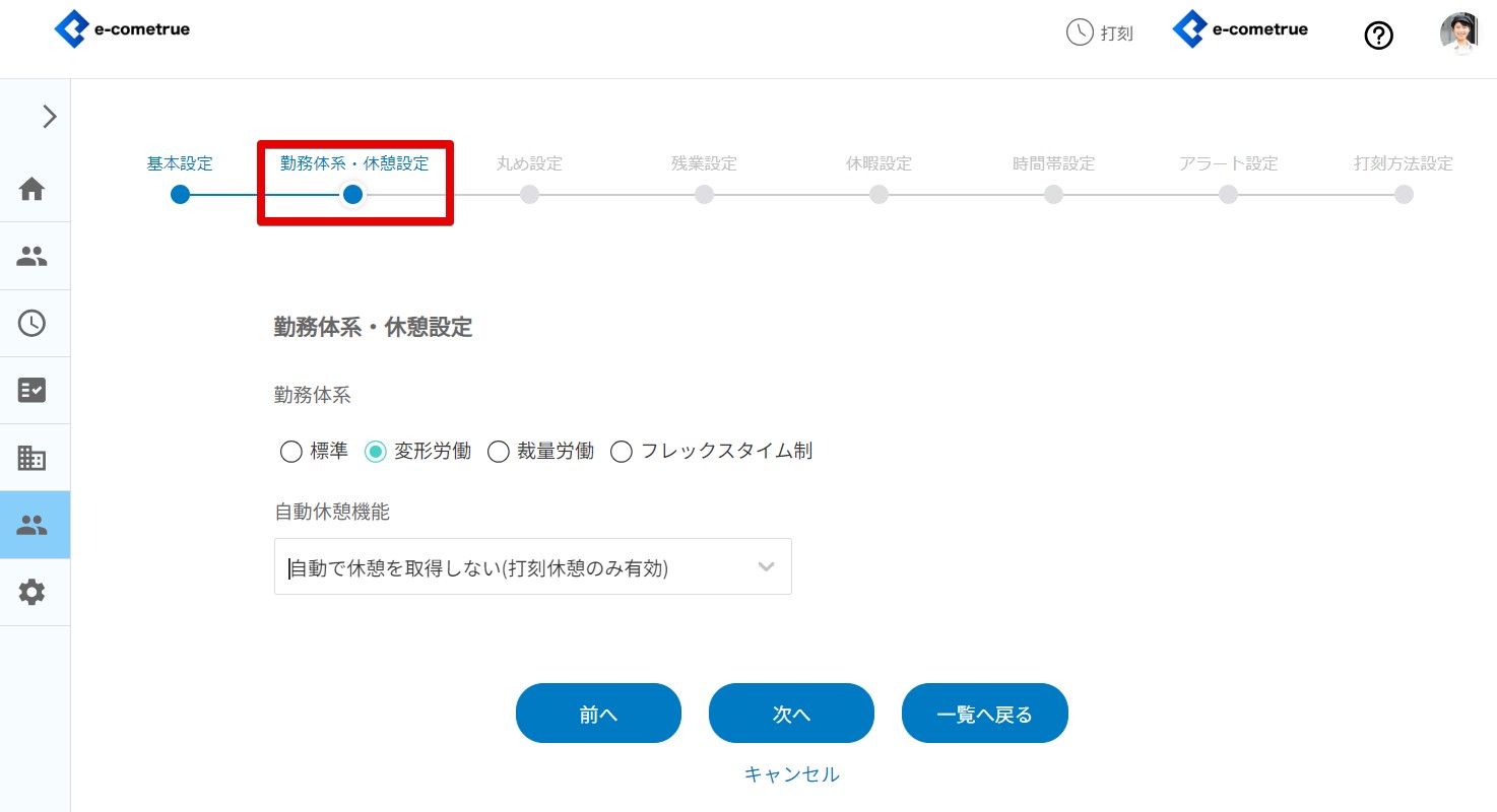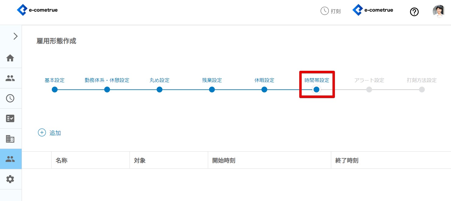 基本設定、勤務体系・休憩設定、丸め設定、残業設定、休暇設定、時間帯設定、アラート設定、打刻方法設定とそれぞれ設定を行い、最後の打刻方法設定まで一連で登録してください。
