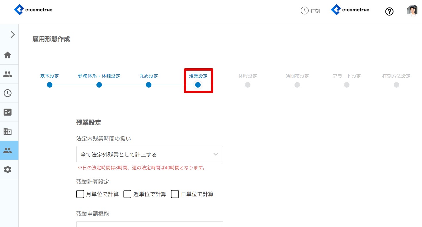 雇用形態の残業設定を登録することができます。