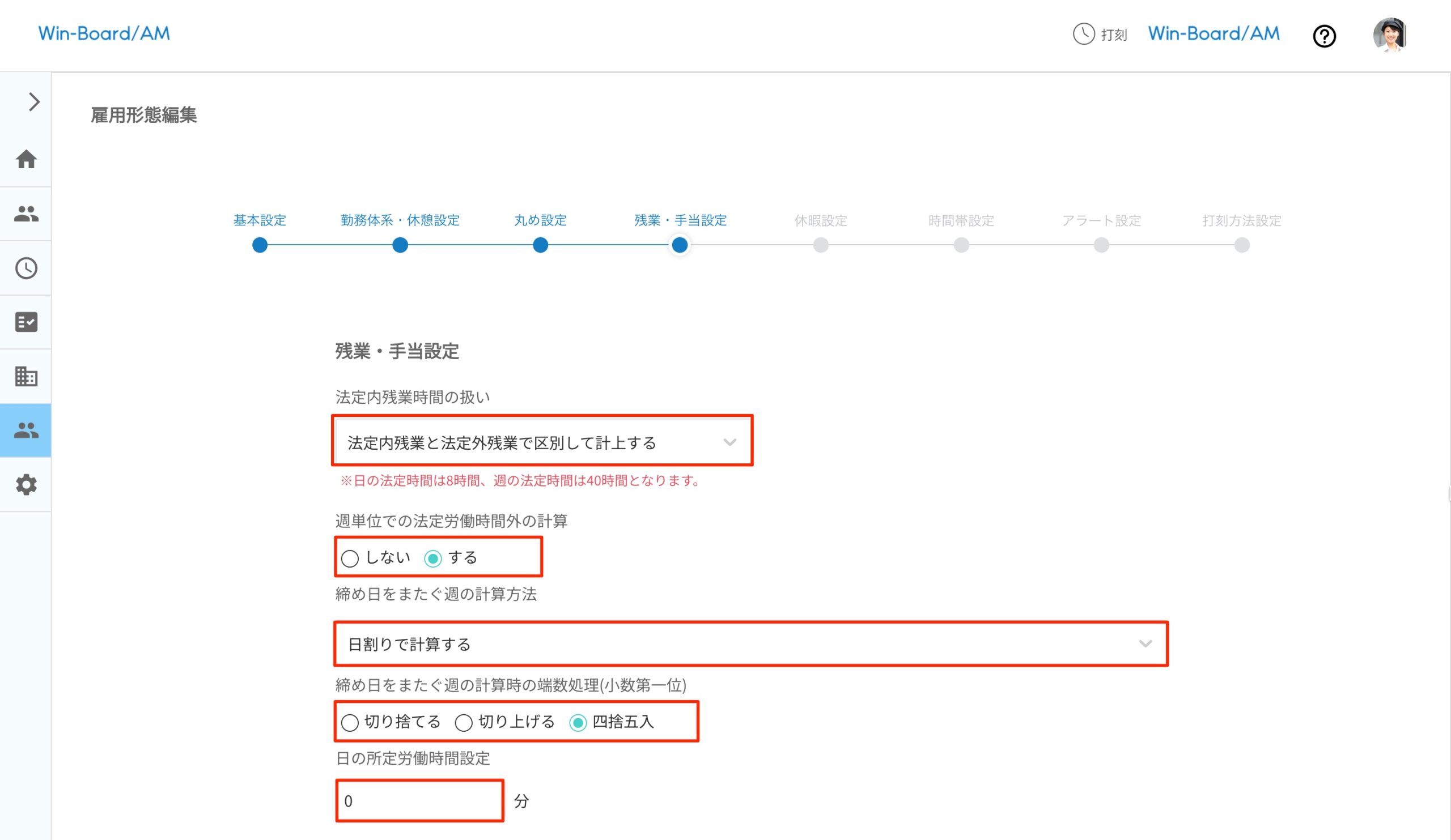 ホーム>勤怠マスタ>雇用形態>編集>残業・手当設定