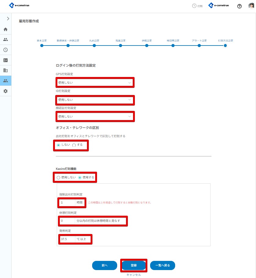 雇用形態の打刻方法設定では、ログイン後の打刻方法やオフィス・テレワークの区別やKaoiro打刻機能を設定します。
