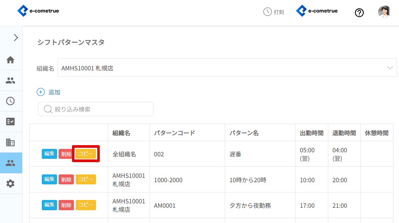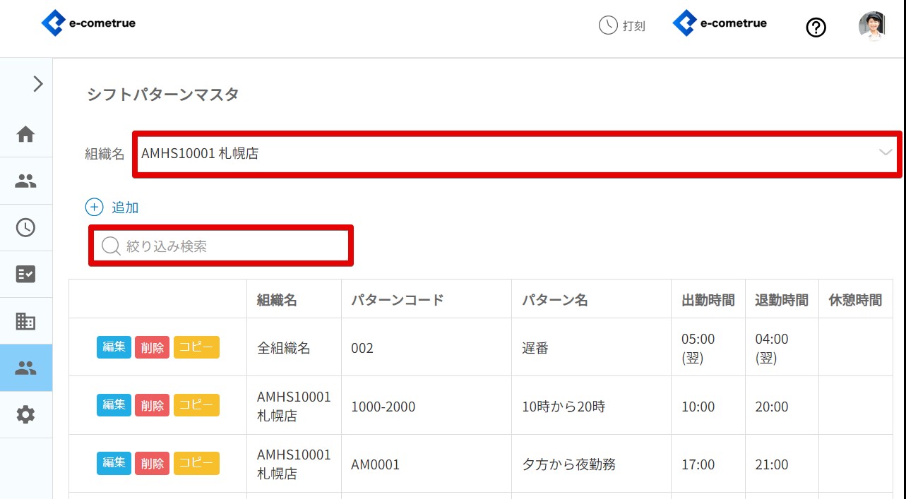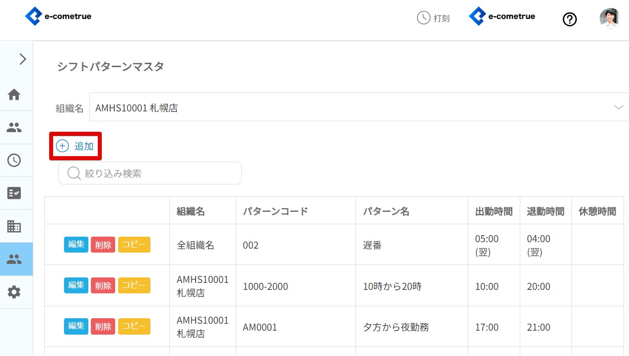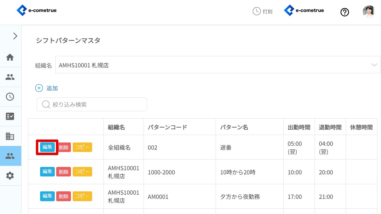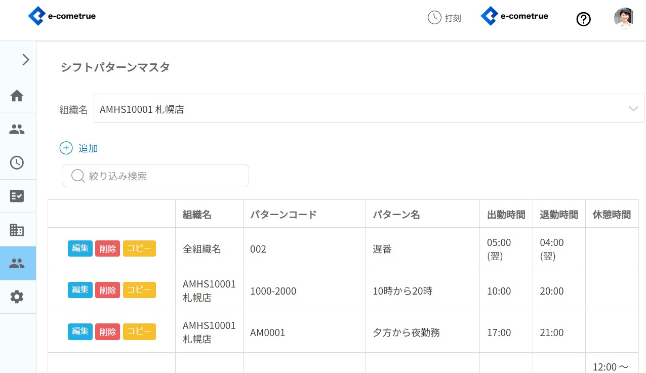 シフトパターンマスタでは、組織・雇用形態にあわせてシフト時間のマスタを管理します。