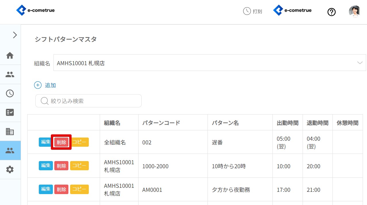 シフトパターンが不必要になったり、誤って登録した場合などにご利用ください。