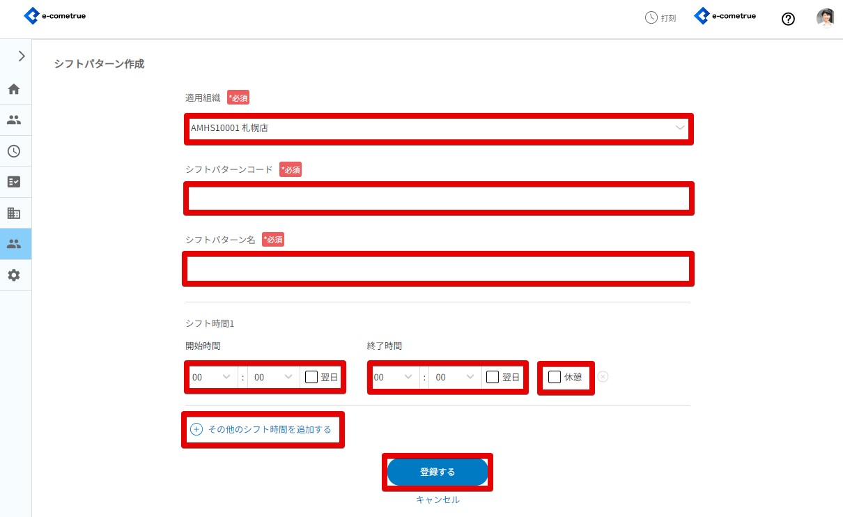 ※シフト時間を削除したい場合は休憩の横にある×ボタンをクリックしてください。 - 登録するをクリックする