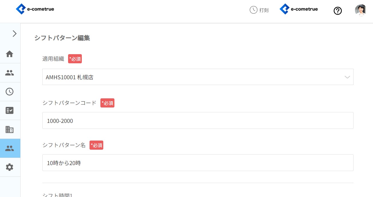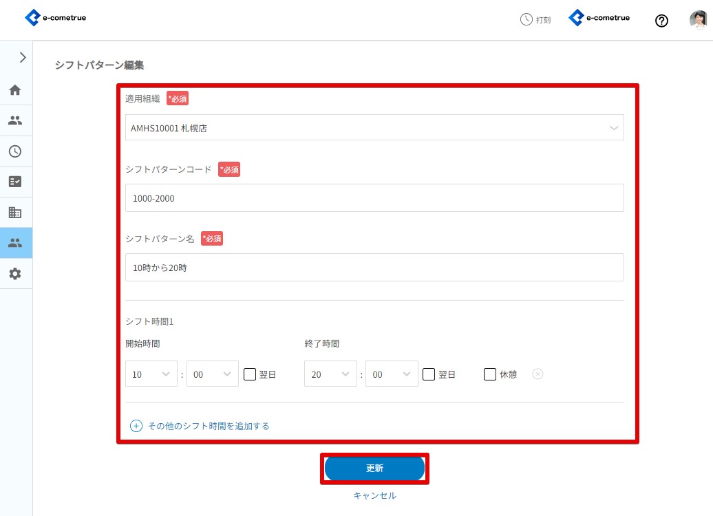 シフトパターン編集 Created 2022年6月10日 Author admin Category シフトパターン 概要 登録されている内容を編集する機能です。 操作 ホーム>勤怠マスタ>シフトパターン>編集 できること シフトパターンの内容を編集する シフトパターンの内容を編集する 登録されている内容を編集する機能です。 各項目を入力してください。 操作方法 変更したい項目を入力する 更新をクリックする ※「シフトパターンマスタの更新」がポップアップ表示されるので登録するをクリックしてください。 ※キャンセルを押すと登録されません。