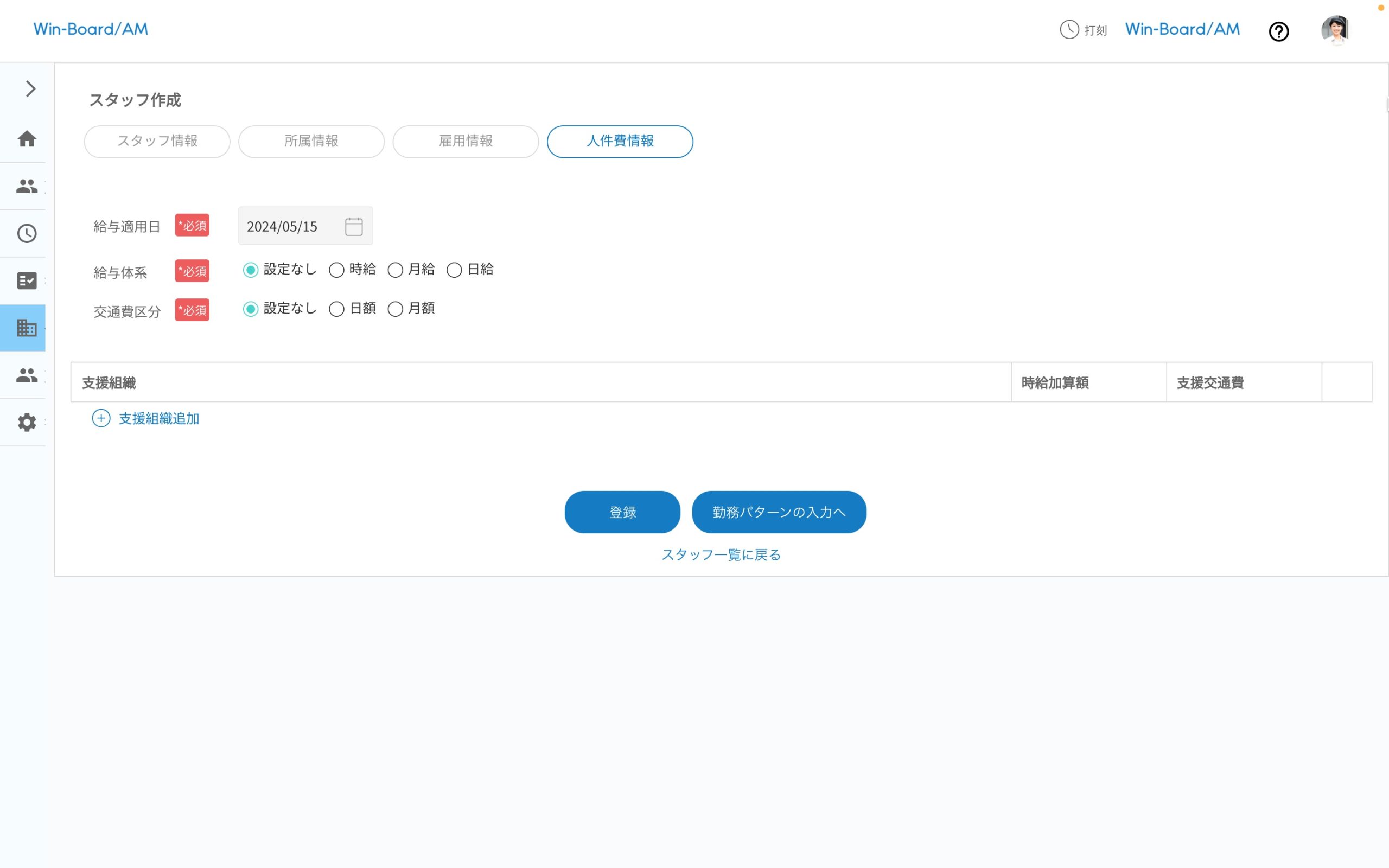 給与や交通費を登録することができ、支援組織や時間帯ごとに加算設定も追加することができます。