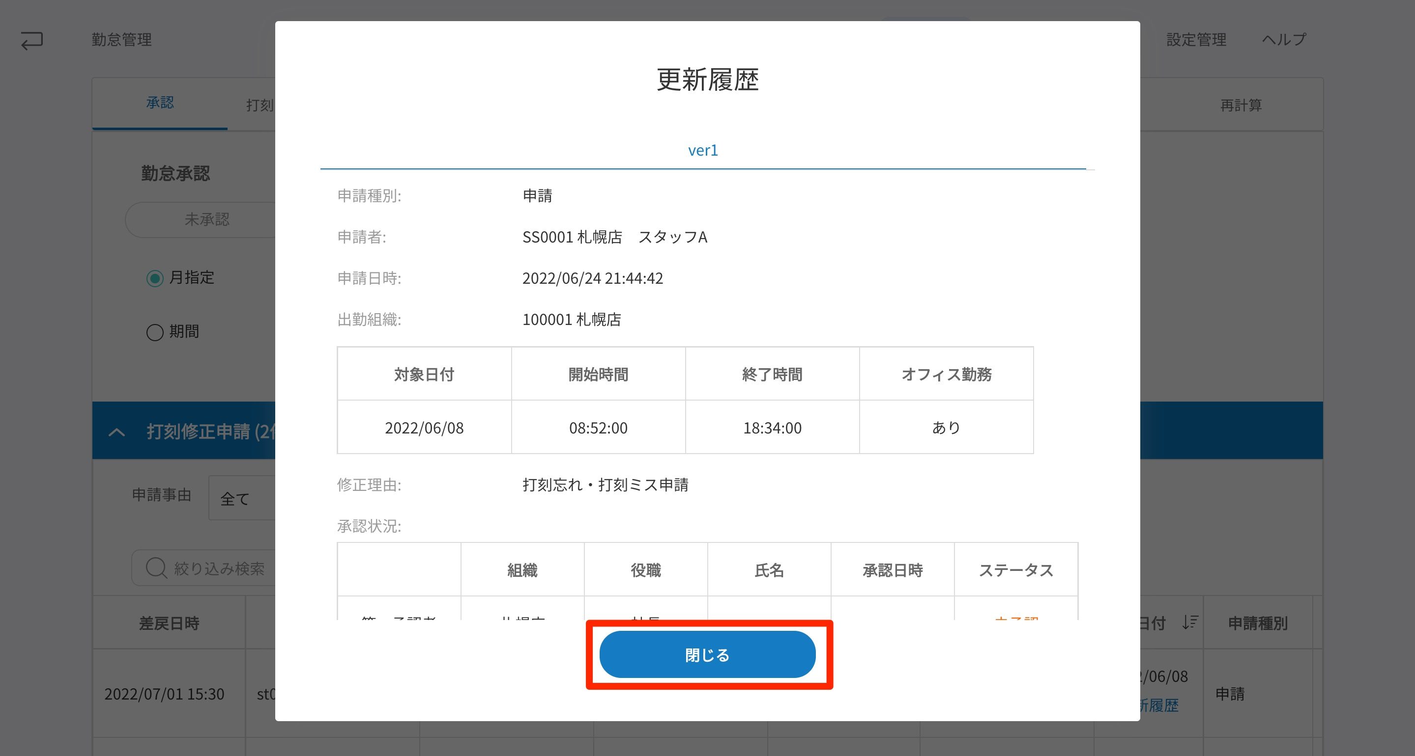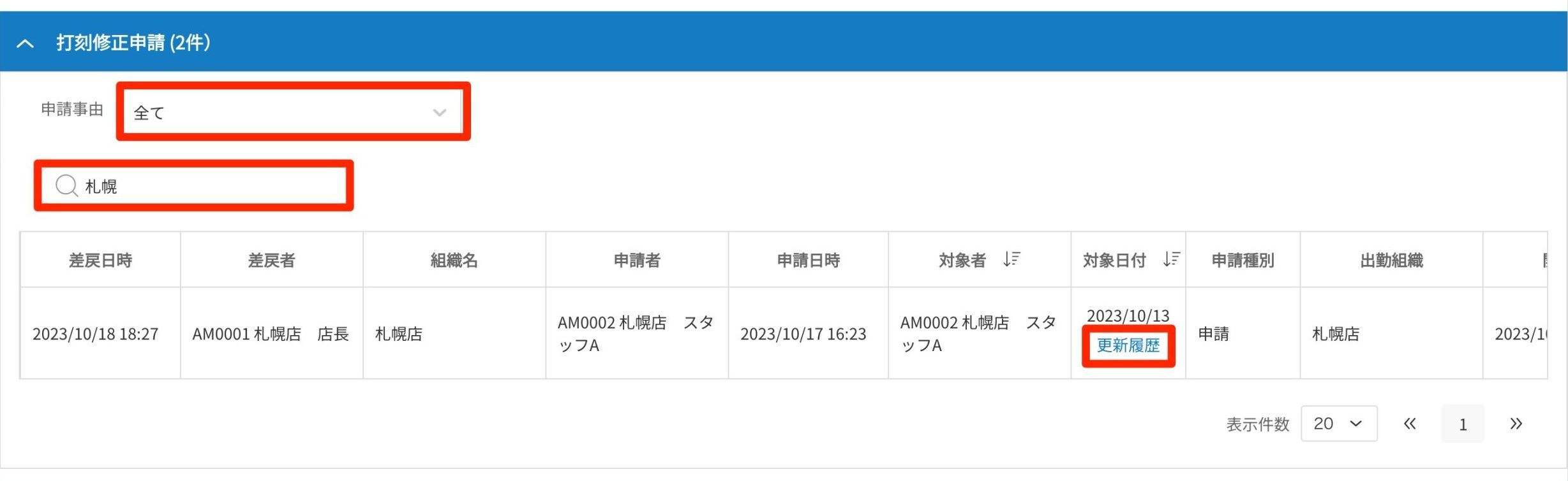 勤怠承認:差戻 Created 2022年7月1日 Author admin Category 承認 概要 勤怠承認の差戻では各種申請1の確認をすることができます。 操作 ホーム>勤怠管理>承認>差戻 できること 各種申請の内容を確認する 各種申請の内容を確認する 各種申請2の内容を確認することができます。 操作方法 期間を選択する 確認したい申請をクリックする 打刻修正申請、休暇申請、残業申請、手当申請、休日出勤申請、振替申請、限度時間超過申請、勤務予定変更申請、積立有給申請 検索したい申請事由を選択する 検索したい文字列を絞り込み検索に入力し絞り込みする 確認したい申請の更新履歴をクリックする ポップアップで更新履歴を確認し、閉じるをクリックする 打刻修正申請、休暇申請、残業申請、手当申請、休日出勤申請、振替申請、限度時間超過申請、勤務予定変更申請、積立有給申請打刻修正申請、休暇申請、残業申請、手当申請、休日出勤申請、振替申請、限度時間超過申請、勤務予定変更申請、積立有給申請