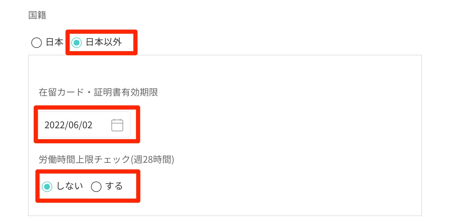 ※未成年の就労時間チェックに使用します。 - 国籍を選択する