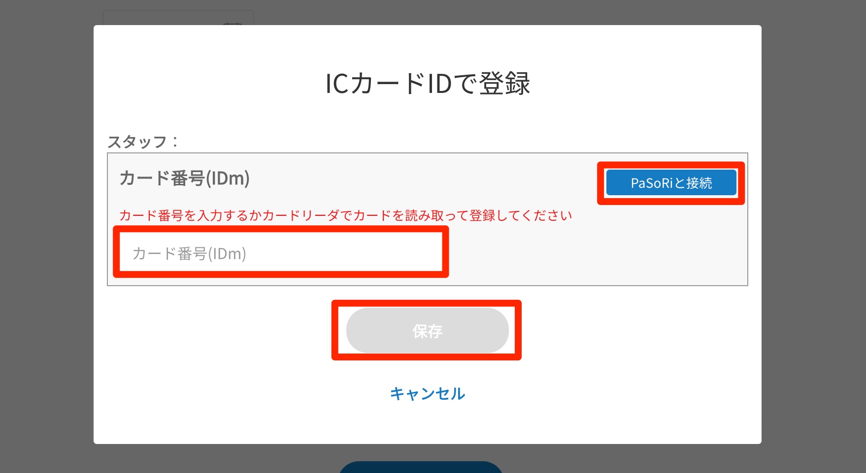 ※PaSoRiと接続する場合はカードリーダでカードを読み取り番号を登録することが出来ます。 - 保存をクリックする