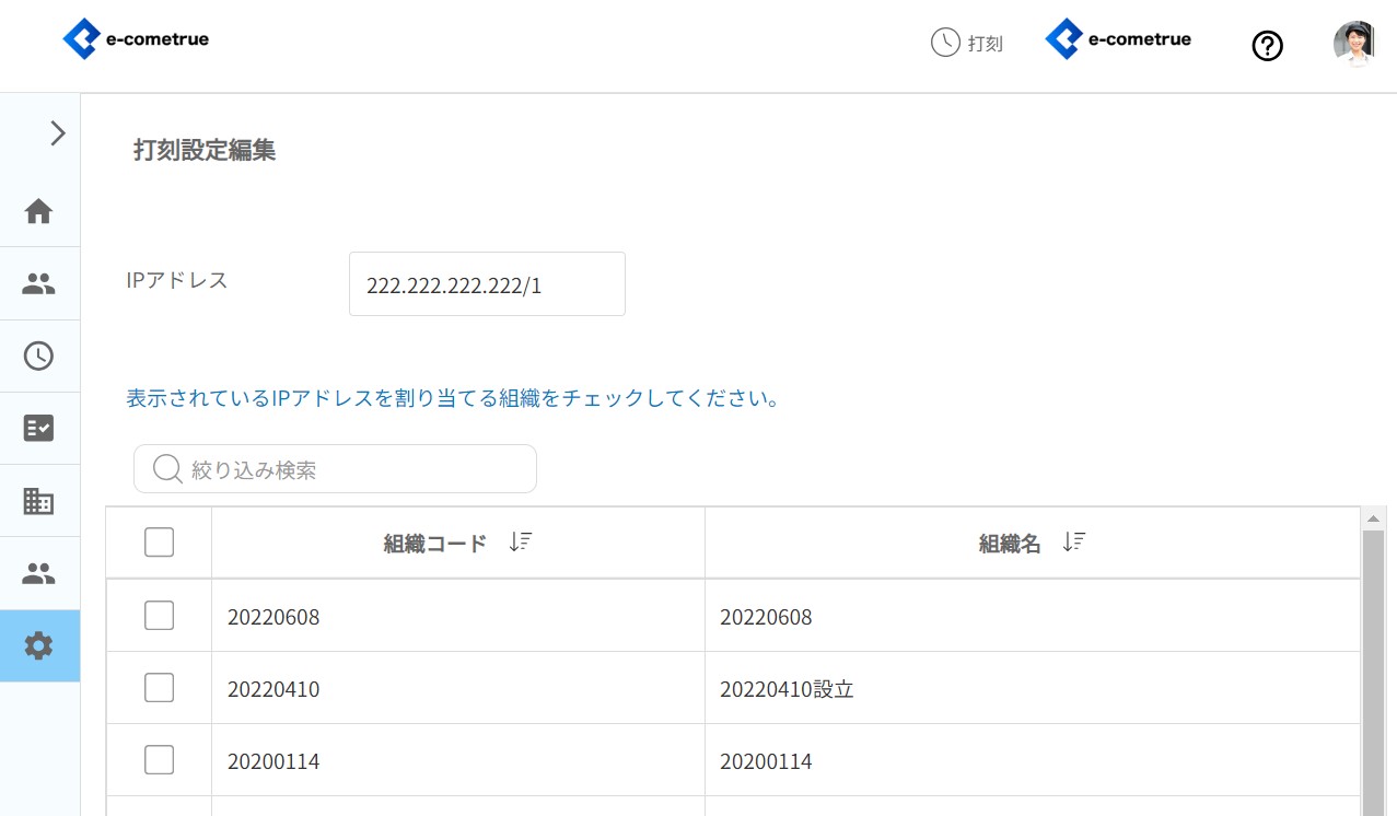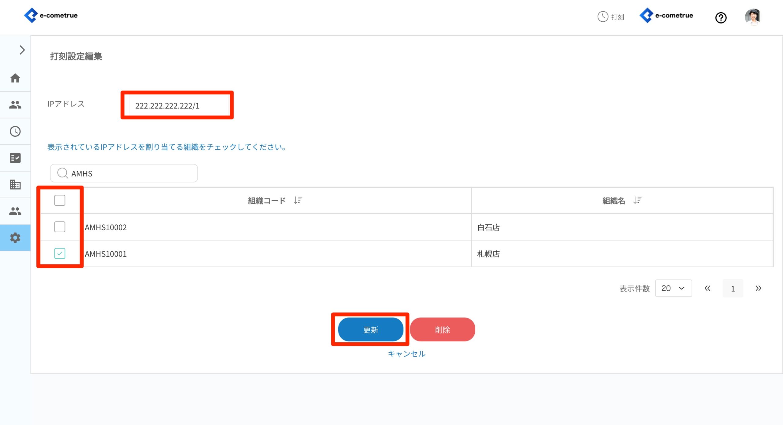 打刻設定編集 Created 2022年6月14日 Author admin Category 打刻設定 概要 登録されている打刻設定を編集することができます。 操作 ホーム>打刻管理>打刻設定>編集 できること 打刻設定を編集する 打刻設定を編集する 登録されている内容を編集する機能です。 各項目を入力してください。 操作方法 変更したいIPアドレスを入力または店舗を変更する 更新をクリックする ※「IPアドレス範囲指定」がポップアップ表示されるので更新するをクリックしてください。 ※キャンセルを押すと登録されません。