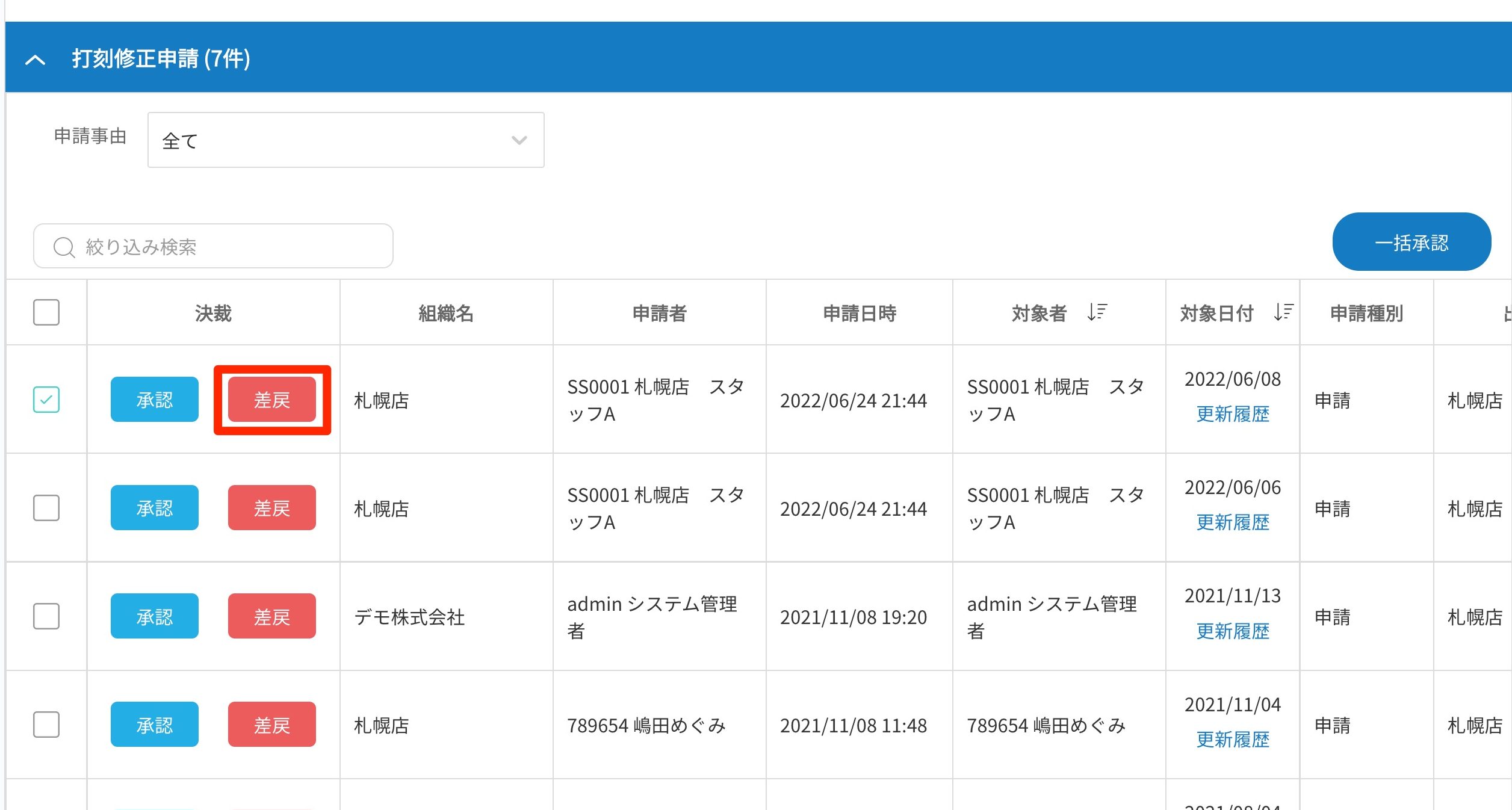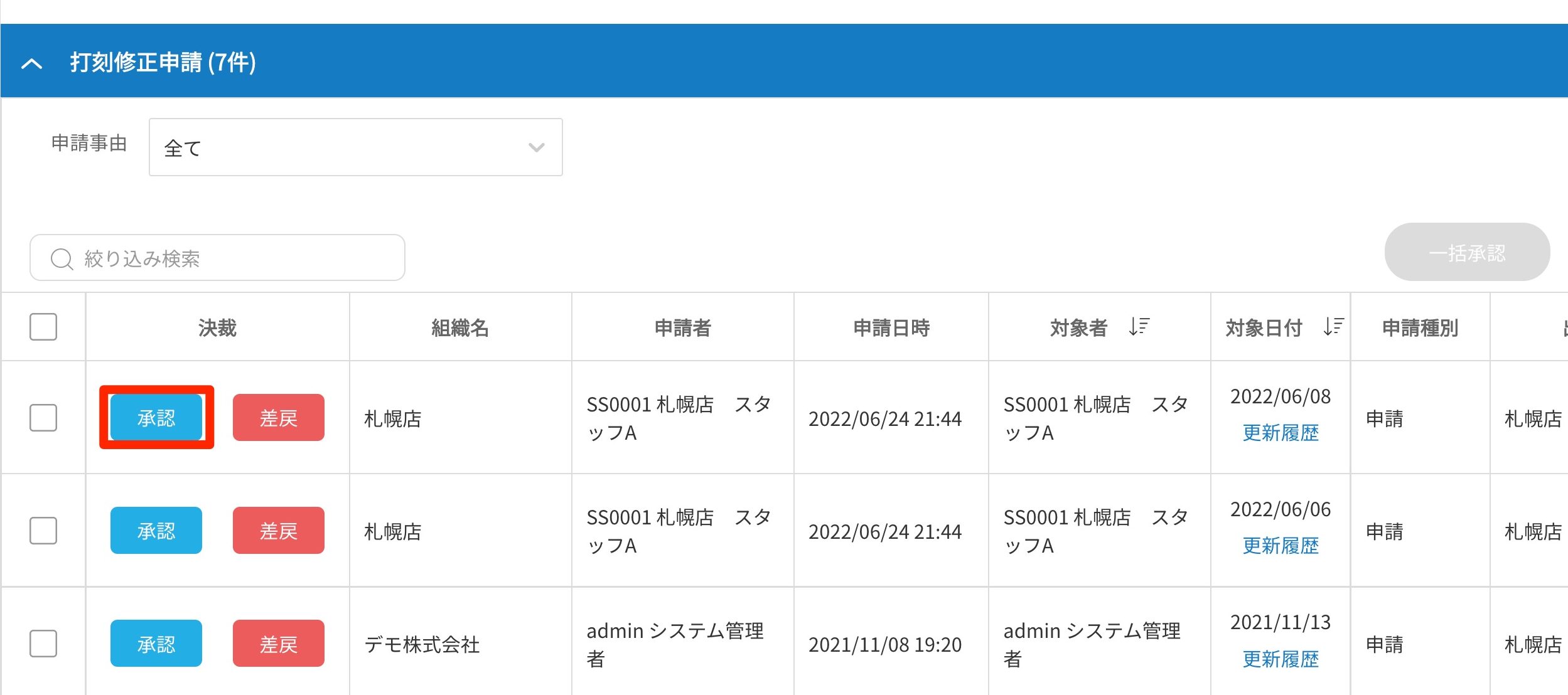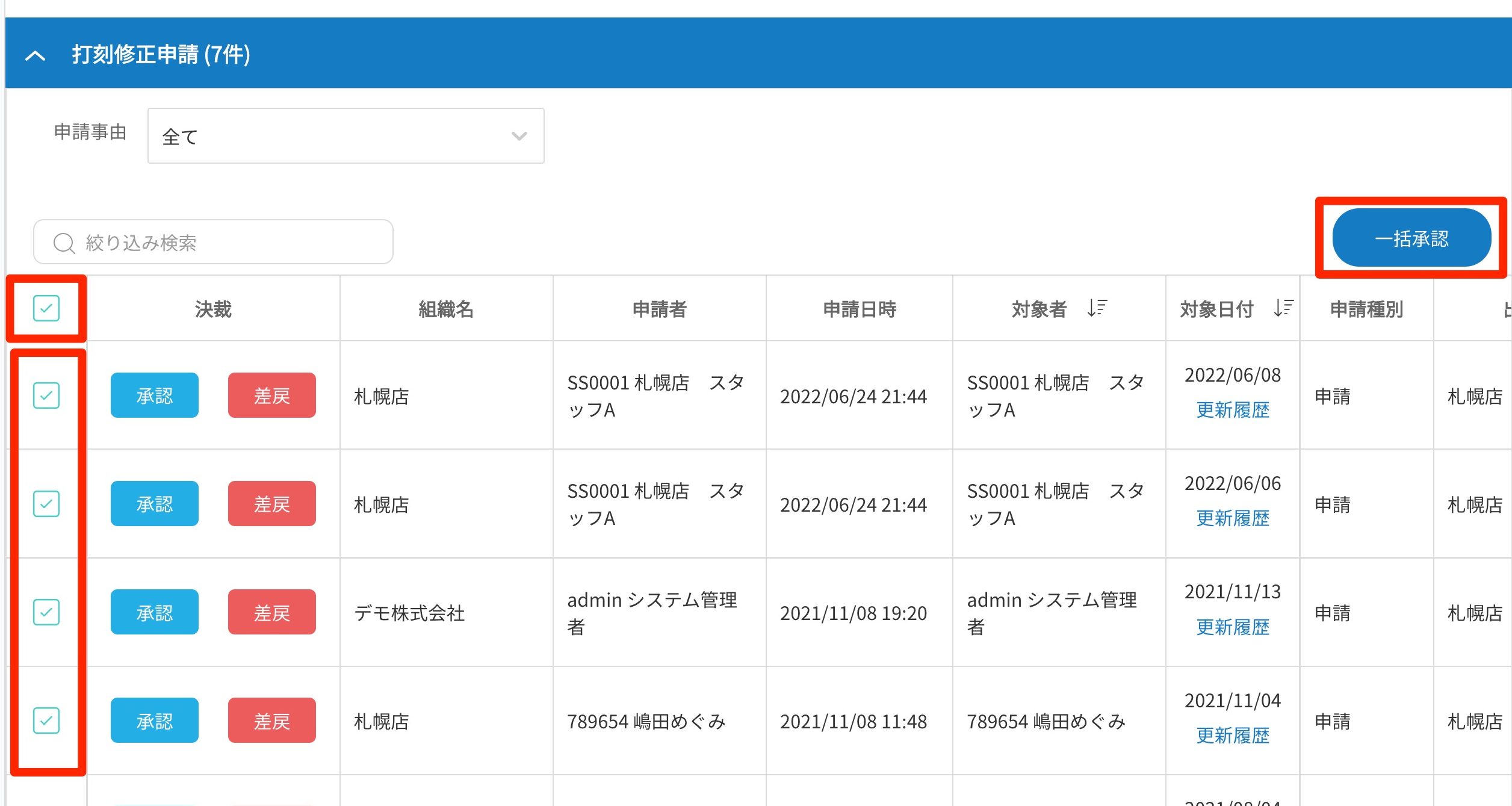 ※先頭のチェックボックスをクリックすると検索された申請が全て選択されます。 - 一括承認をクリックする
