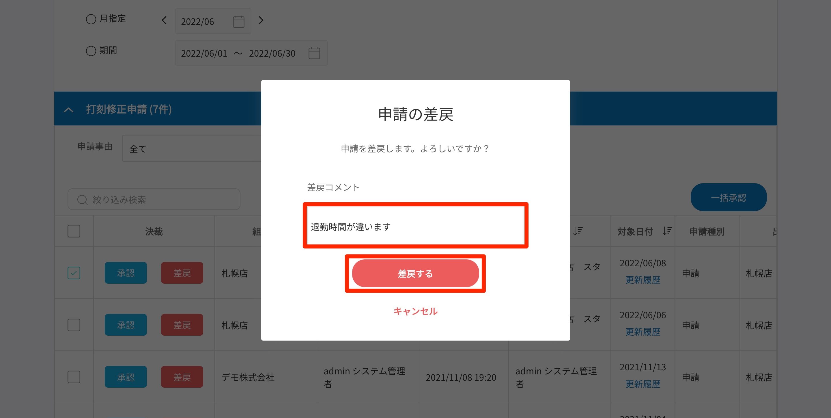 - 「申請の差戻」のポップアップ表示されるので差戻コメントを記入する