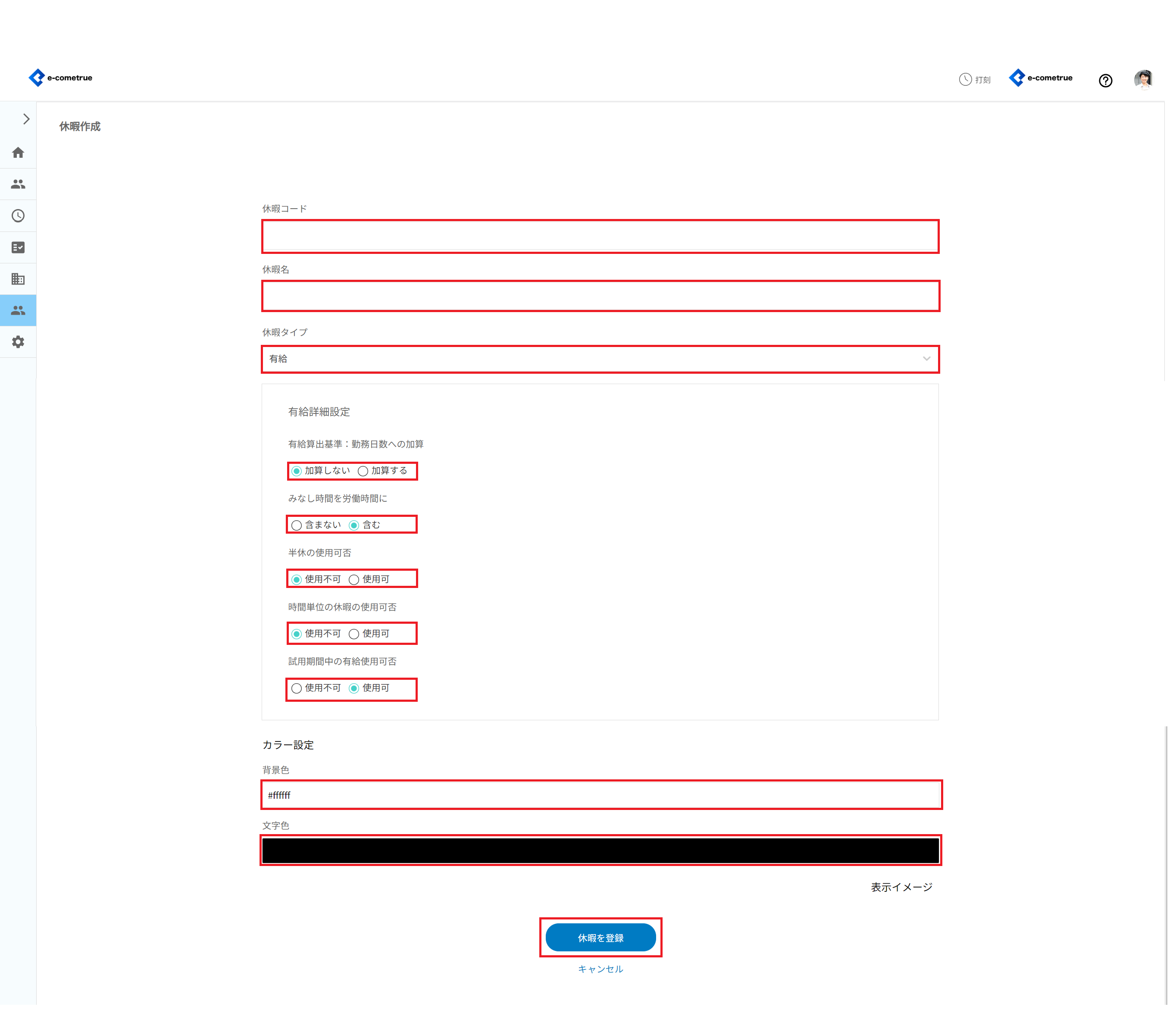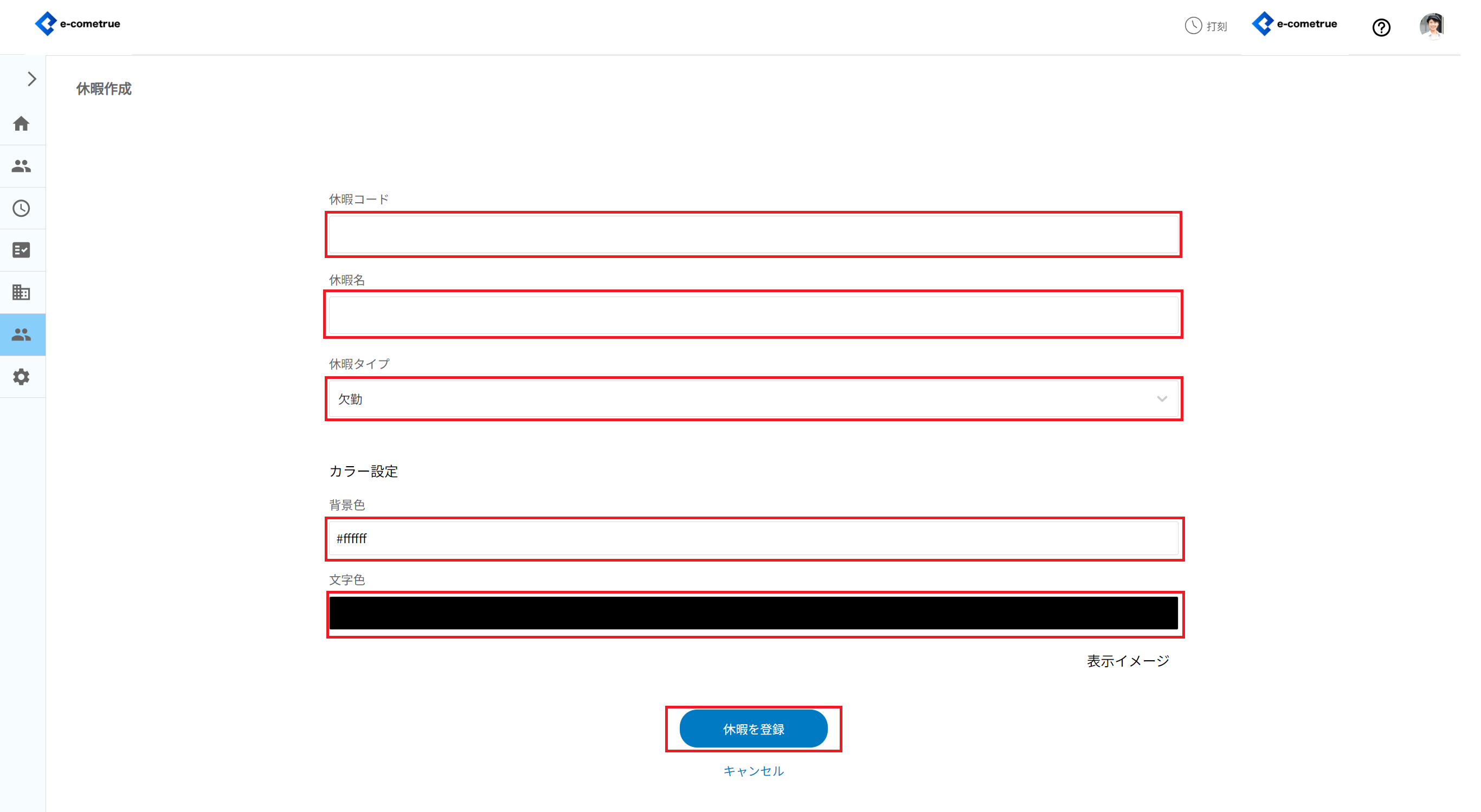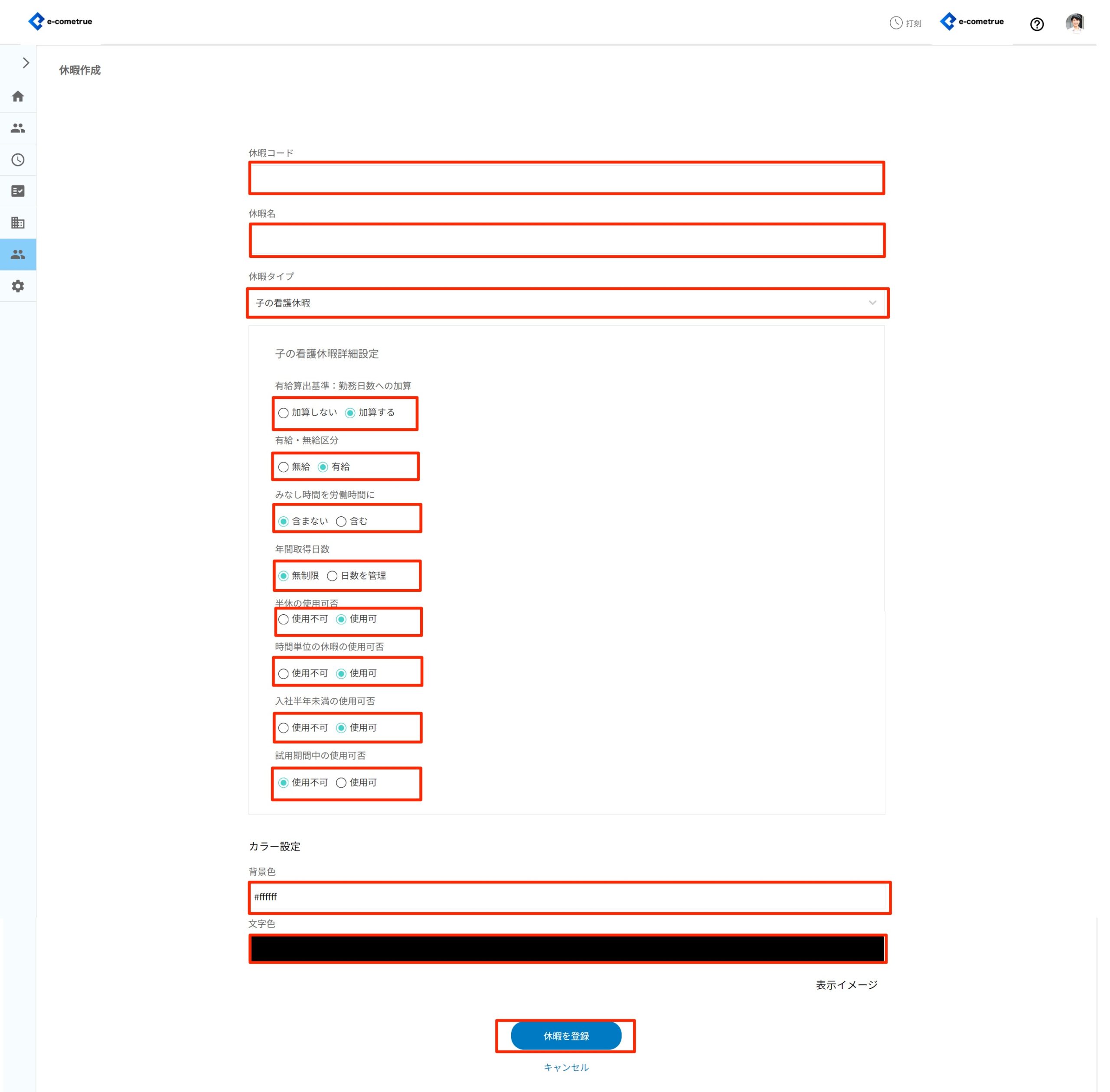 ※16進数のカラーコードがわかる場合は、入力欄に直接数値でカラーコードを入力することもできます。カラーコード表などを参考に、#(シャープ)からはじまる6桁の英数字を入力してください。 - 休暇を登録をクリックする