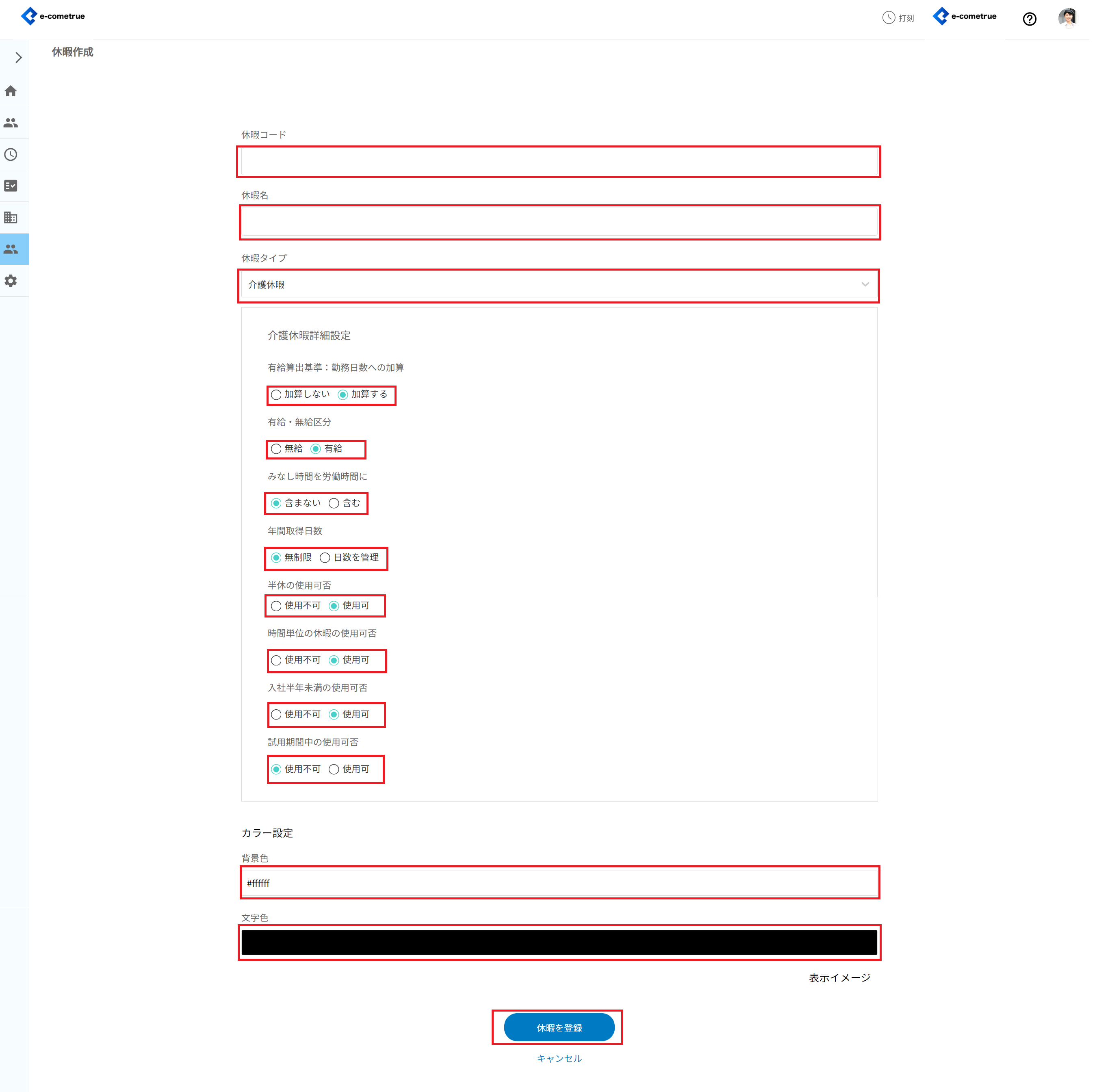 休暇(介護休暇)を登録することができます。