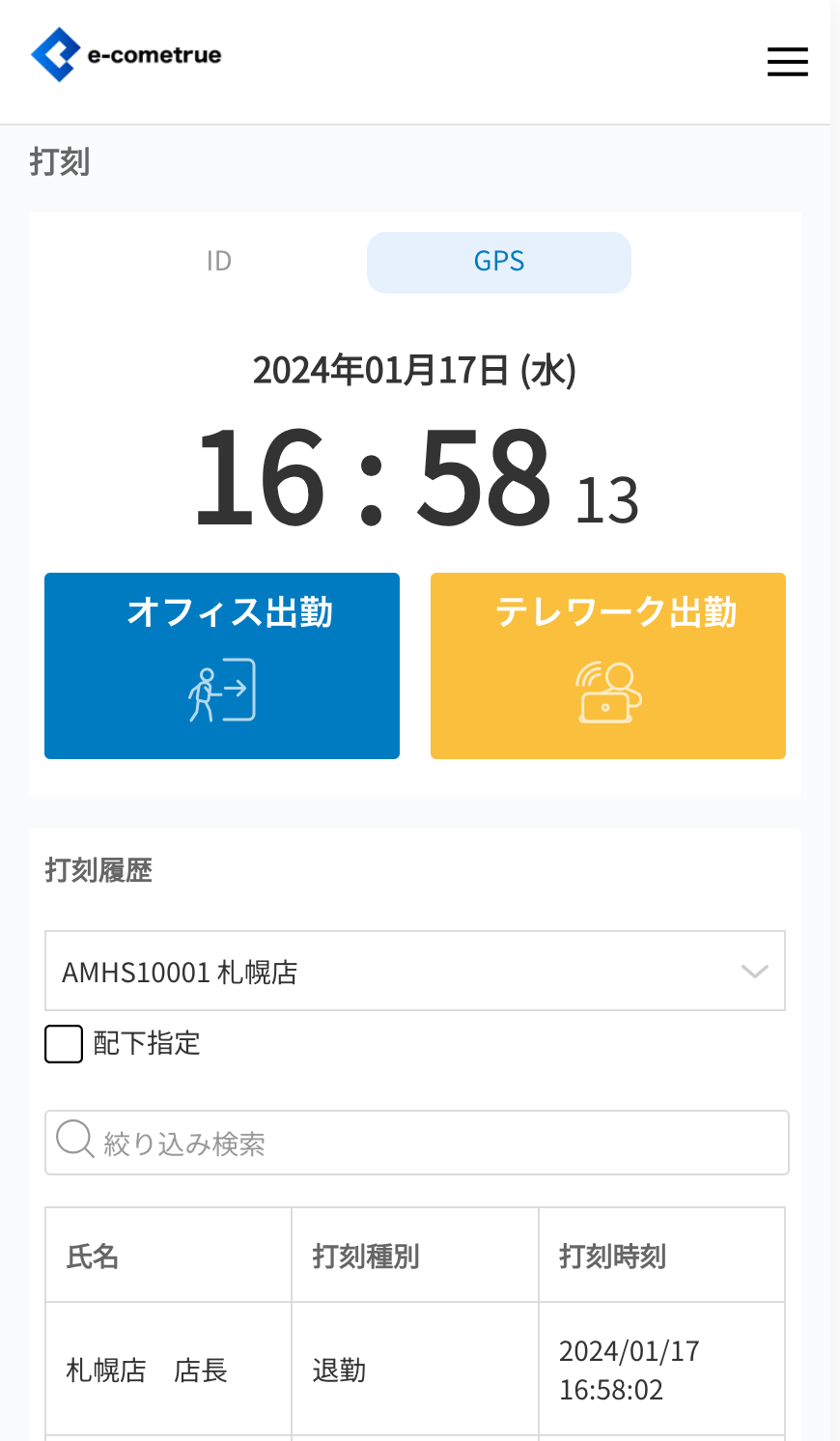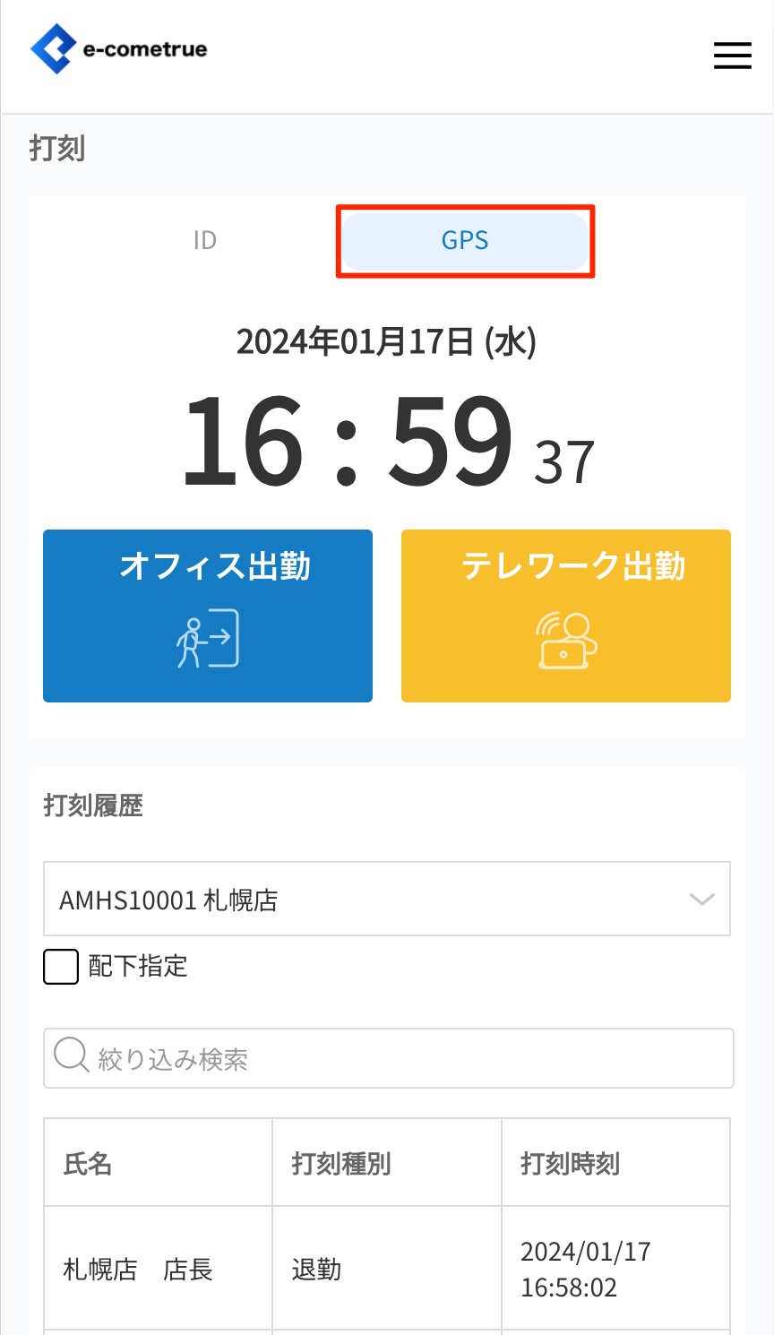 GPS打刻はログイン後のスタッフ個人の打刻画面で行えます。