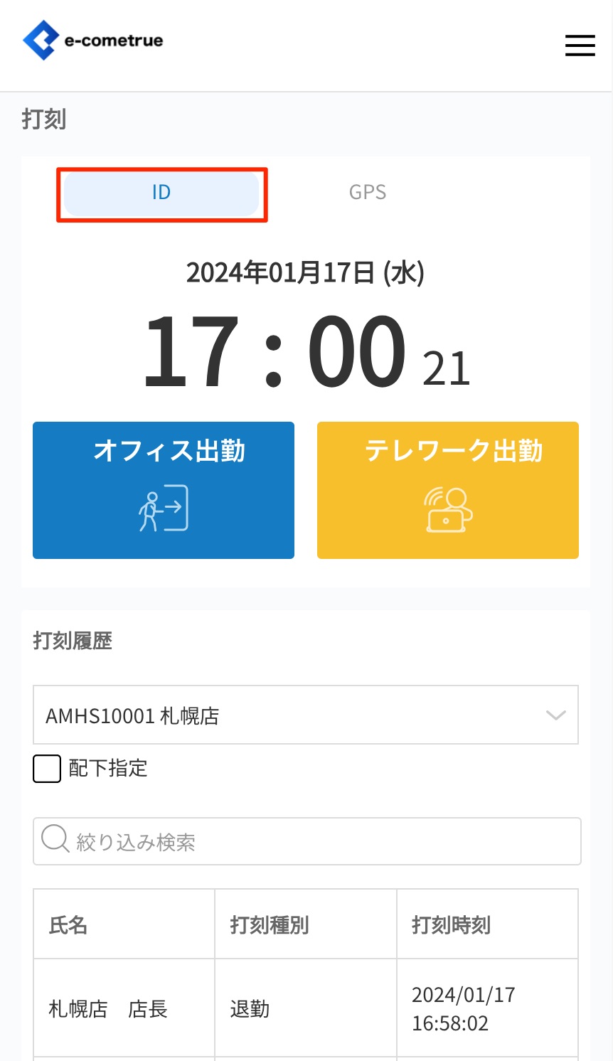 スマートフォン版ではID打刻(スマホ版)、GPS打刻(スマホ版)が行えます。