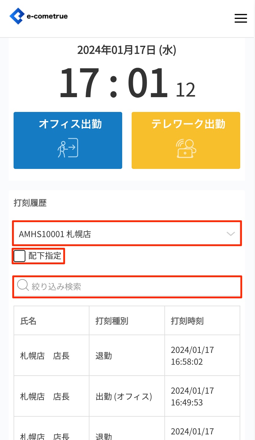 ログインしたスタッフのみが出退勤や休憩の打刻を行うことができ、打刻履歴を確認することができます。